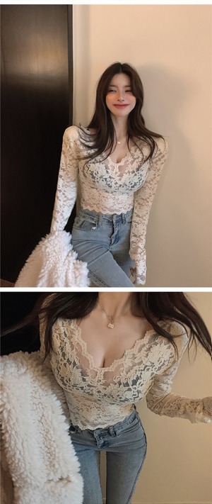Vネックレースシャツ レディーススプリングサマーメッシュトップス ショートTシャツ ロング 春物 夏物 セブンプリンセス98353598695