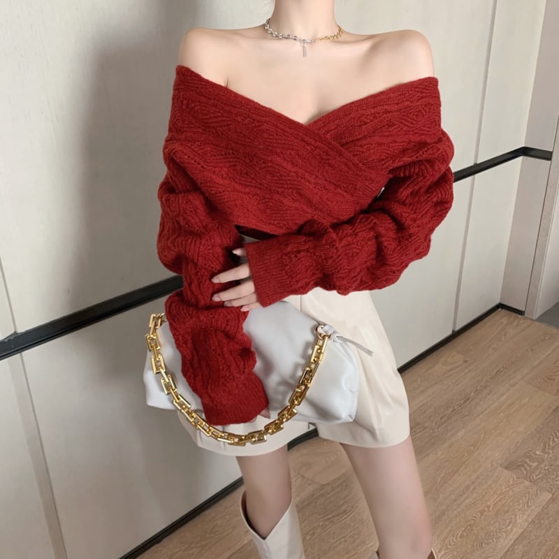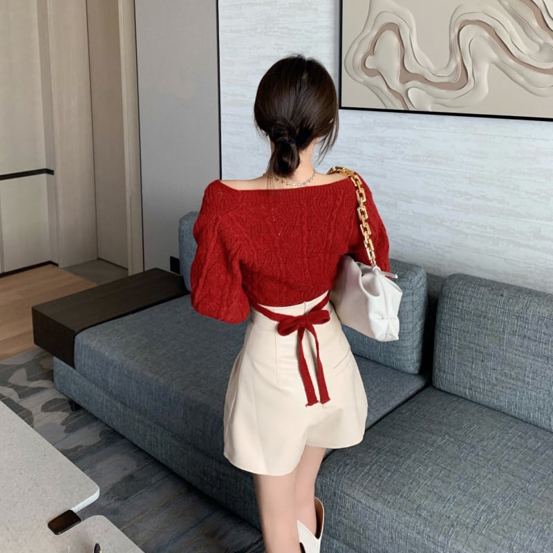 ニットセーター レディーススタンダードスタイルVネックバックショートレッドトップス スプリングサマー ロング レトロ 春物 夏物 セブンプリンセス74788887927