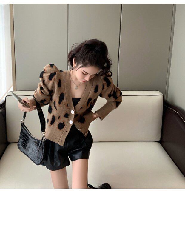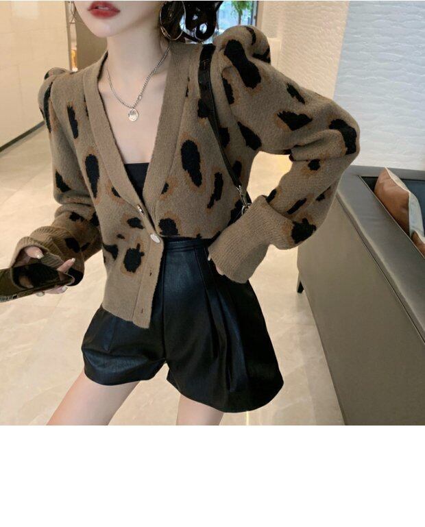 レオパードプリント柄Vネックセーター カーディガンジャケット アウタースタンダードスタイルニット長袖スリーブトップス ロング レトロ スプリング 春物 サマー 夏物 セブンプリンセス11827646288