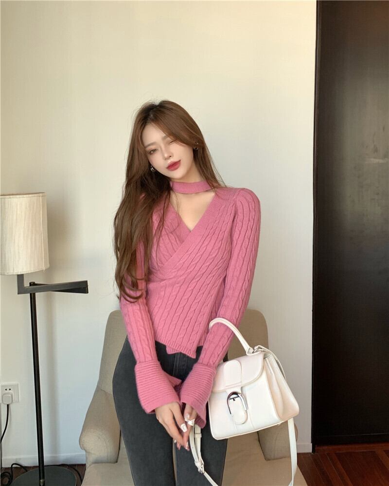 ニットセーター スプリングサマーホルタークロスVネックスリムショートトップス ロング 春物 夏物 セブンプリンセス34112999912
