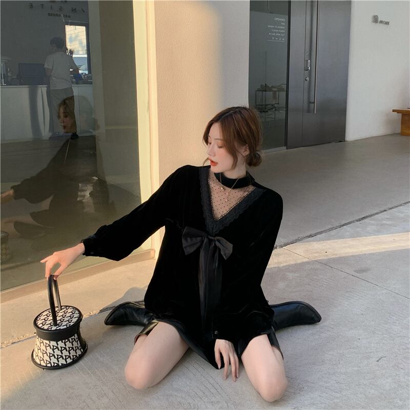 ブラックスカート スプリングスタンダードスタイルルーズリボンベルベットドレス レトロ 春物 セブンプリンセス90768196151