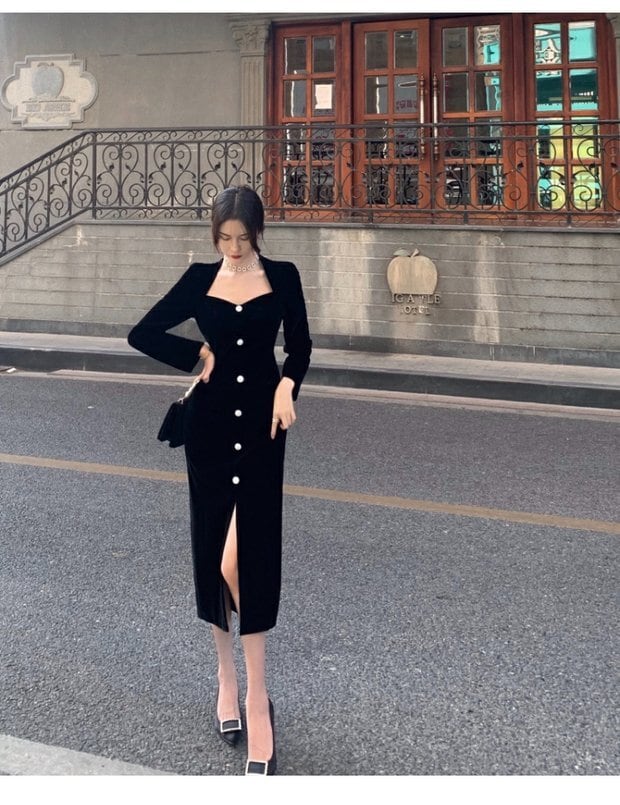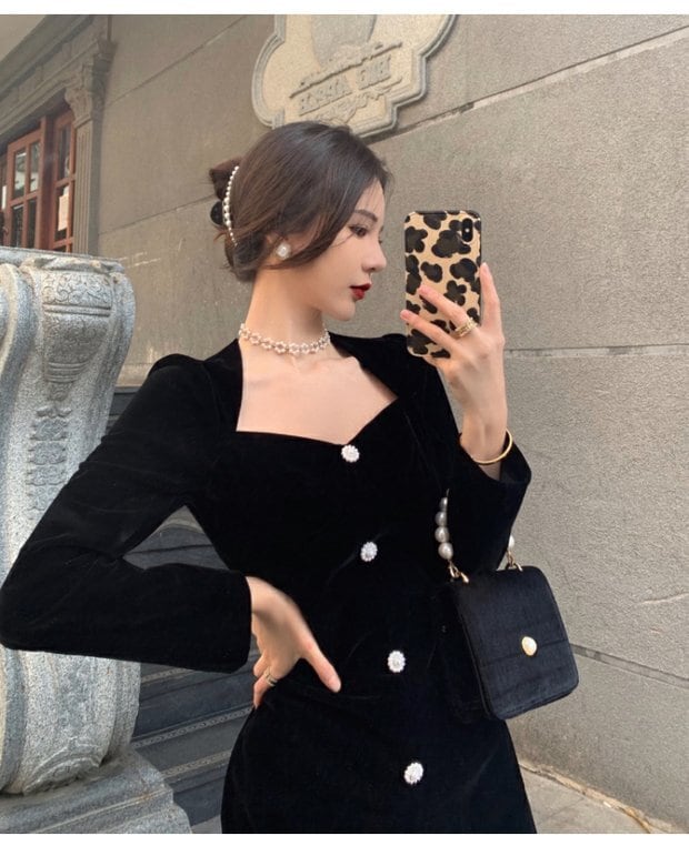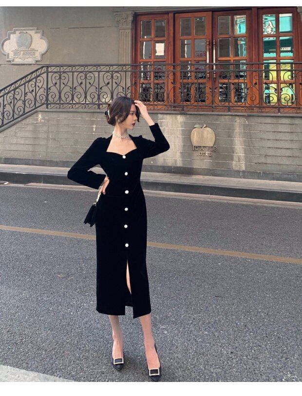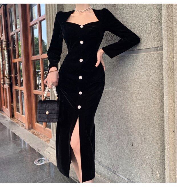 ベルベットドレス スプリングスタイルウェストスリットロングスカート スタンダードブラック レトロ 春物 セブンプリンセス76023848370