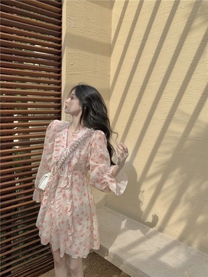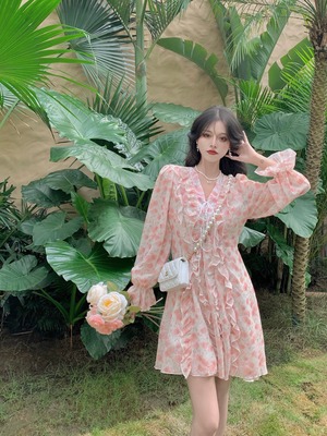 フローラルドレス スタンダードVネックスカート サマー薄手ウェストAライン レトロ 夏物 花柄 セブンプリンセス1654493961