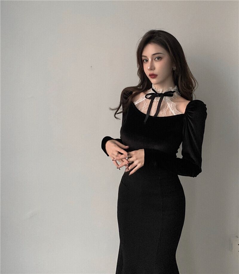 スタンダードレーストップス スプリングショートブラックベルベットシャツ レトロ 春物 セブンプリンセス40645900277