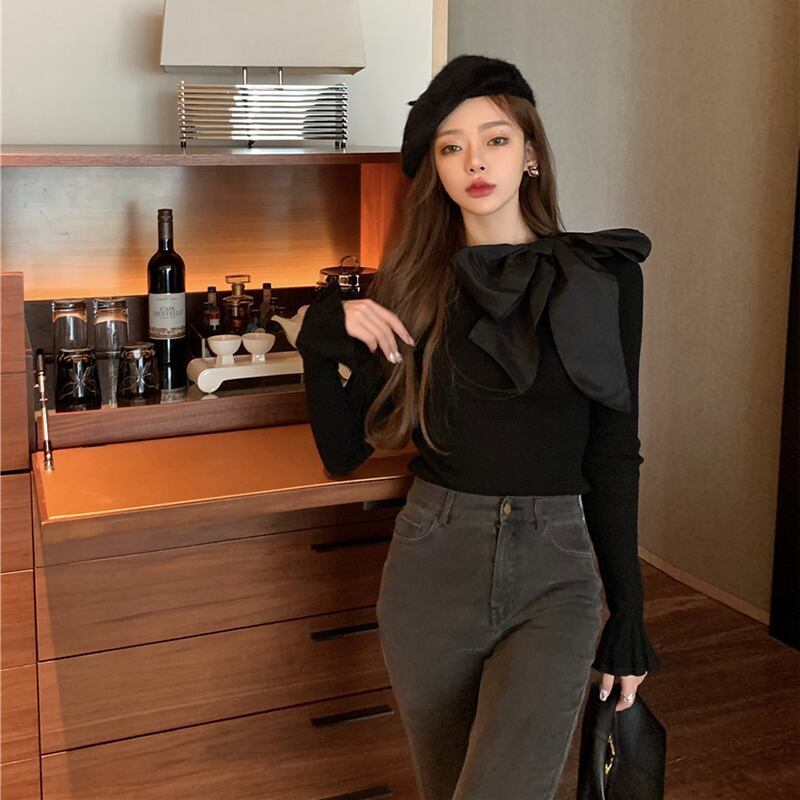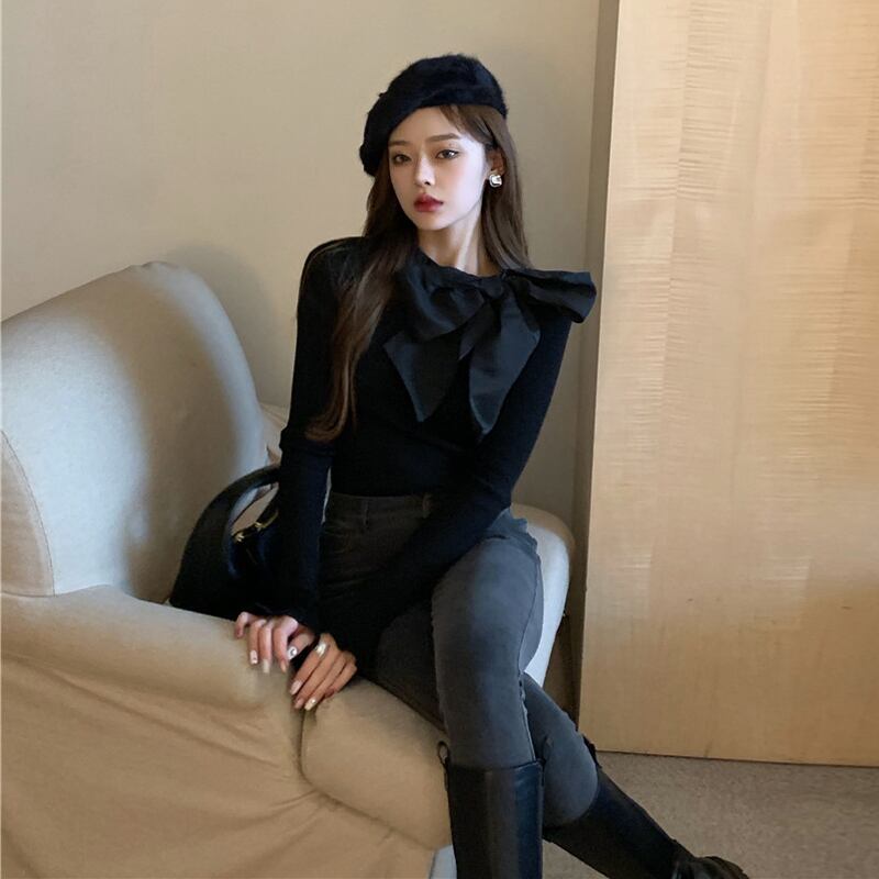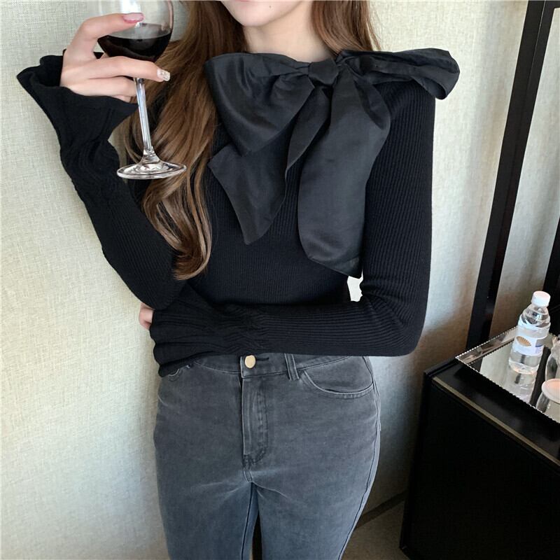 ニット スプリングサマースタイルスリムトップス プルオーバー ブラックセーター ロング リボン 春物 夏物 セブンプリンセス71445130232