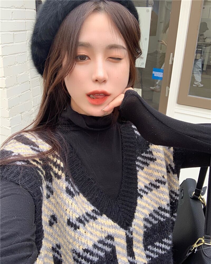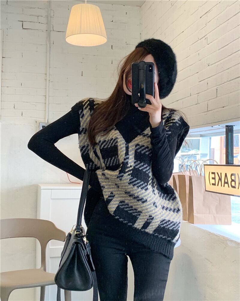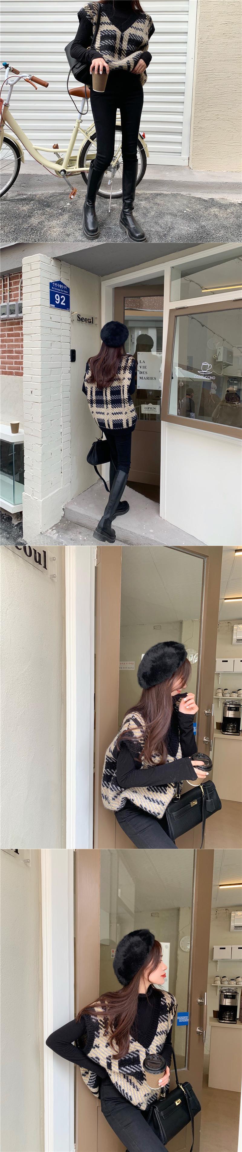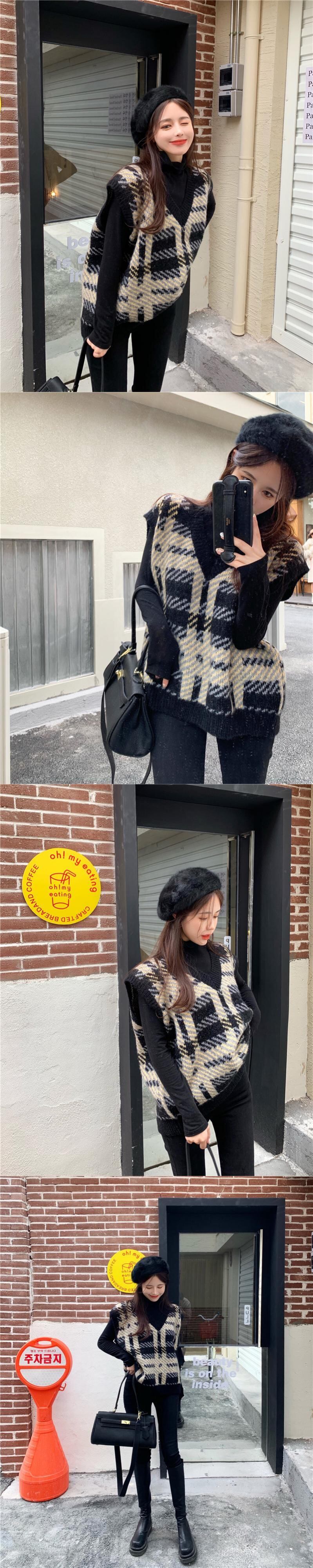 スタンダード格子柄ニットスタイルスプリングサマールーズVネックセーター レトロ 春物 夏物 セブンプリンセス8040327352
