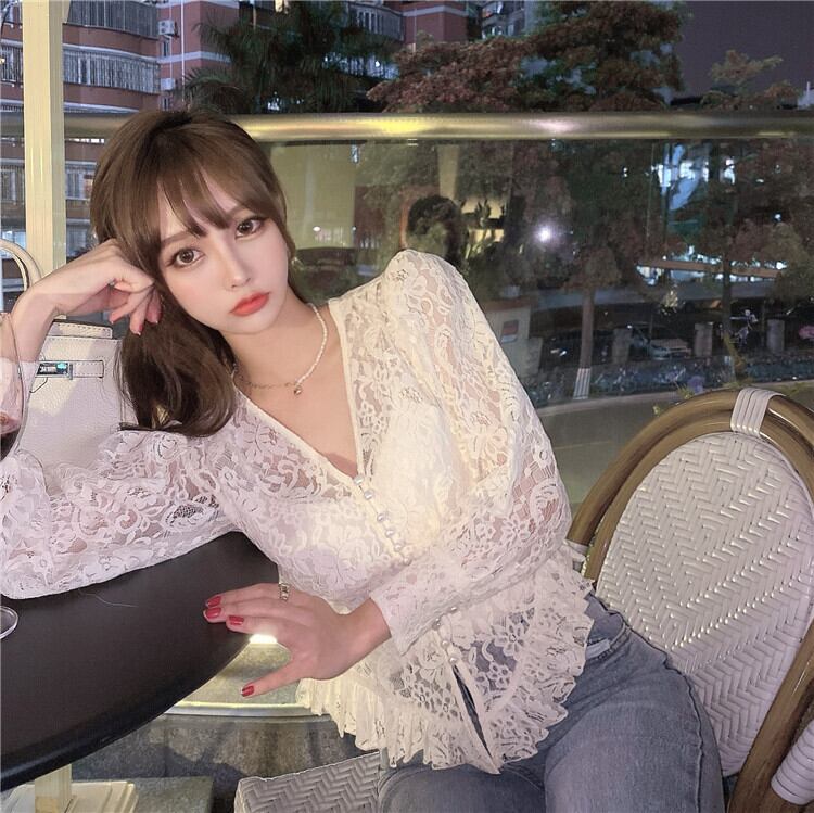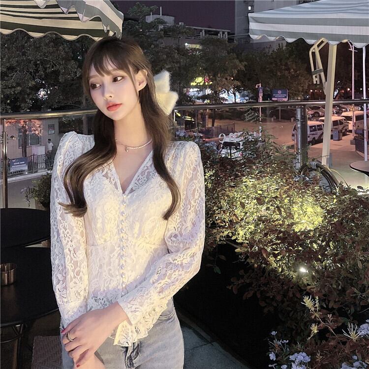 ホワイトレースシャツ オータムウィンターVネックトップス ロング 秋物 冬物 セブンプリンセス79724468920