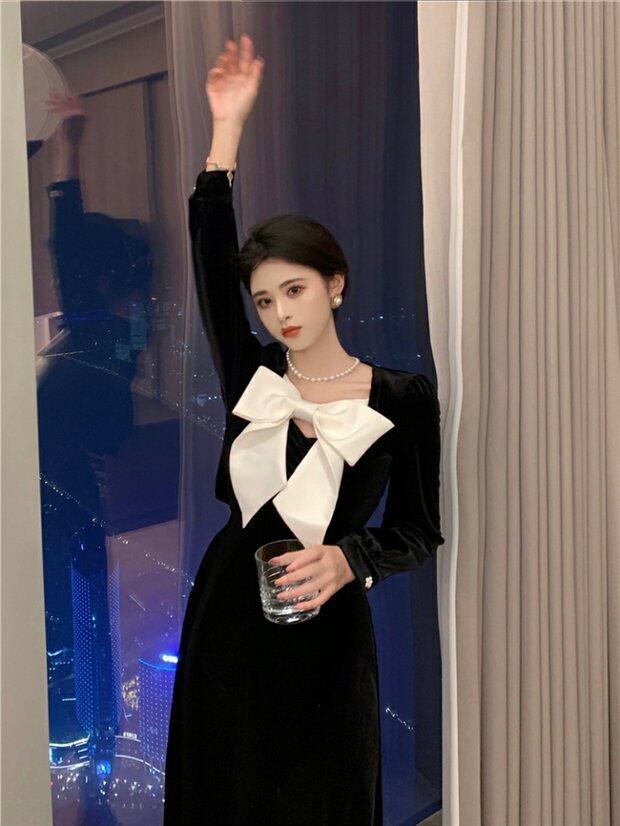 ベルベットドレス スプリングサマースタンダードリボンウェストブラックロングスカート レトロ 長袖 春物 夏物 セブンプリンセス81816497009