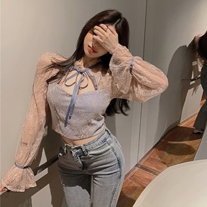 レースシャツ スプリングサマースリムショートブラウス ロング 春物 夏物 レースアップ セブンプリンセス36311428672