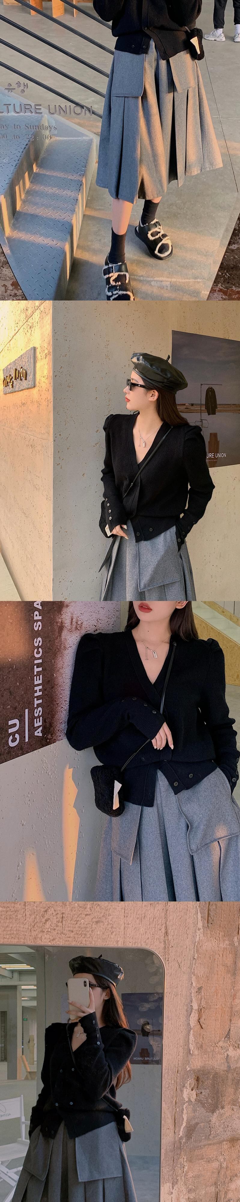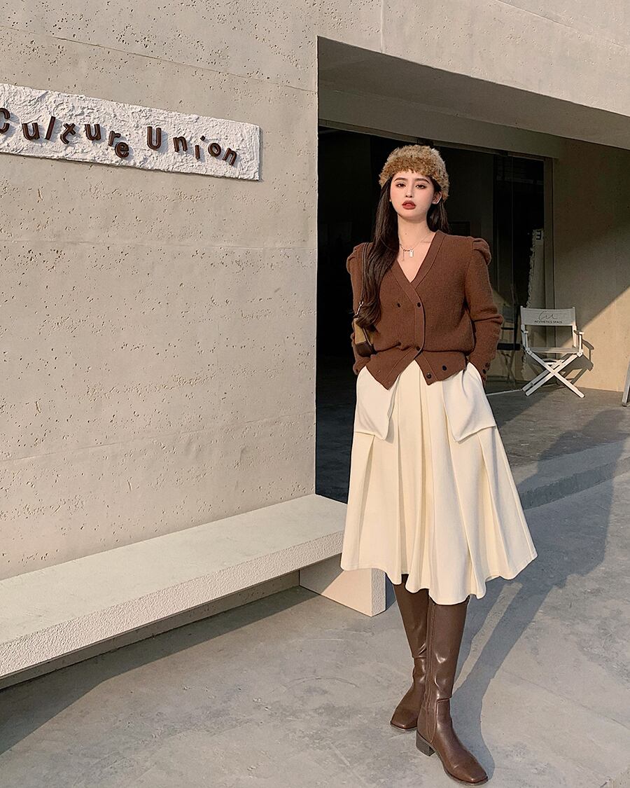 色:白いプリーツスカート,黒いセーターコート,グレープリーツスカート,茶色のセーターコート
