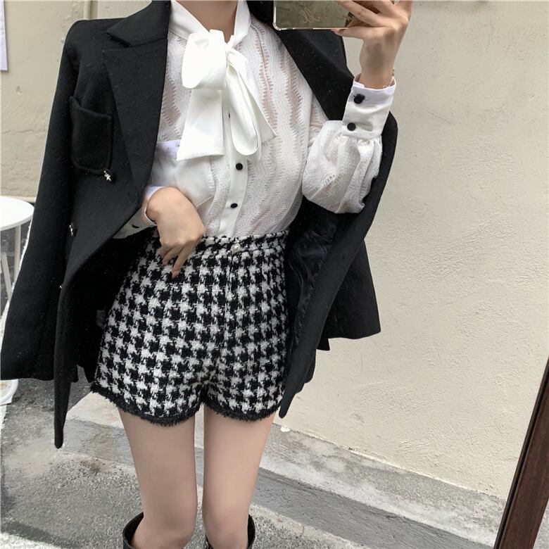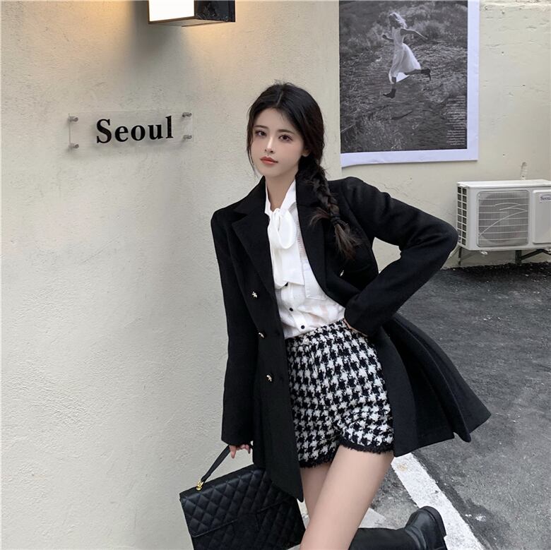 色:白のシャツ,チェック柄ショーツ,ブラックウールコートレギュラー,綿の黒いウールのコート