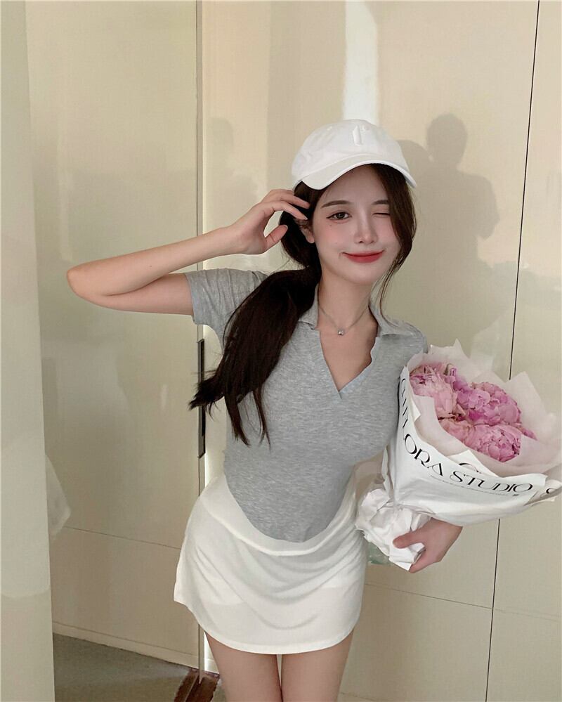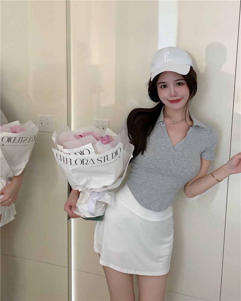 色:ホワイトトップ,グレートップ,ネイビーブルーのシャツ,白いスカート,ティングレーのスカート