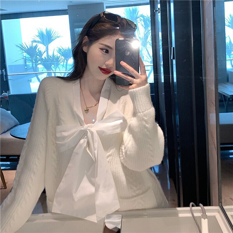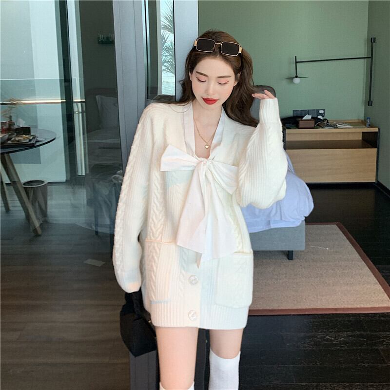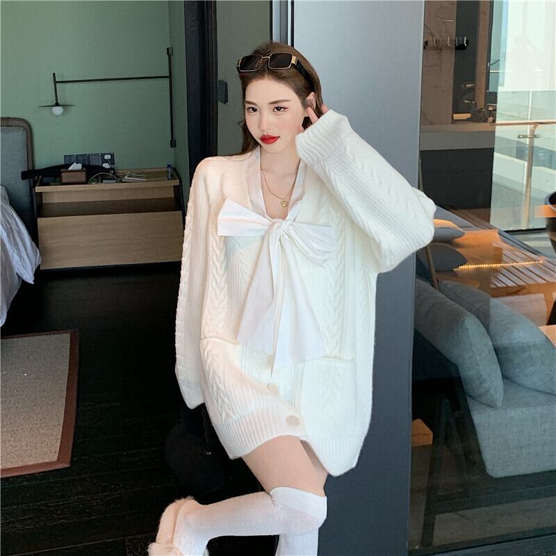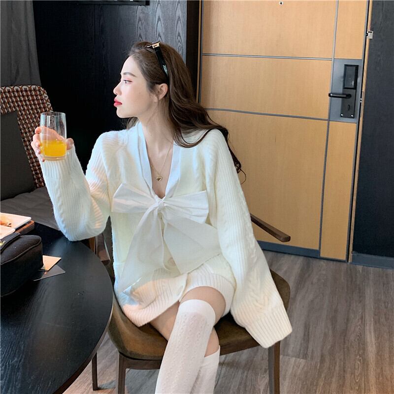 ホワイトセーター ジャケット ルーズVネックニットカーディガントップス ウィンター 冬物 セブンプリンセス70156509321