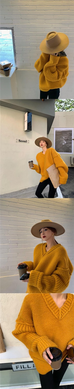 イエローVネックセーター スプリングサマールーズスタイルニットトップス 春物 夏物 セブンプリンセス25267246338
