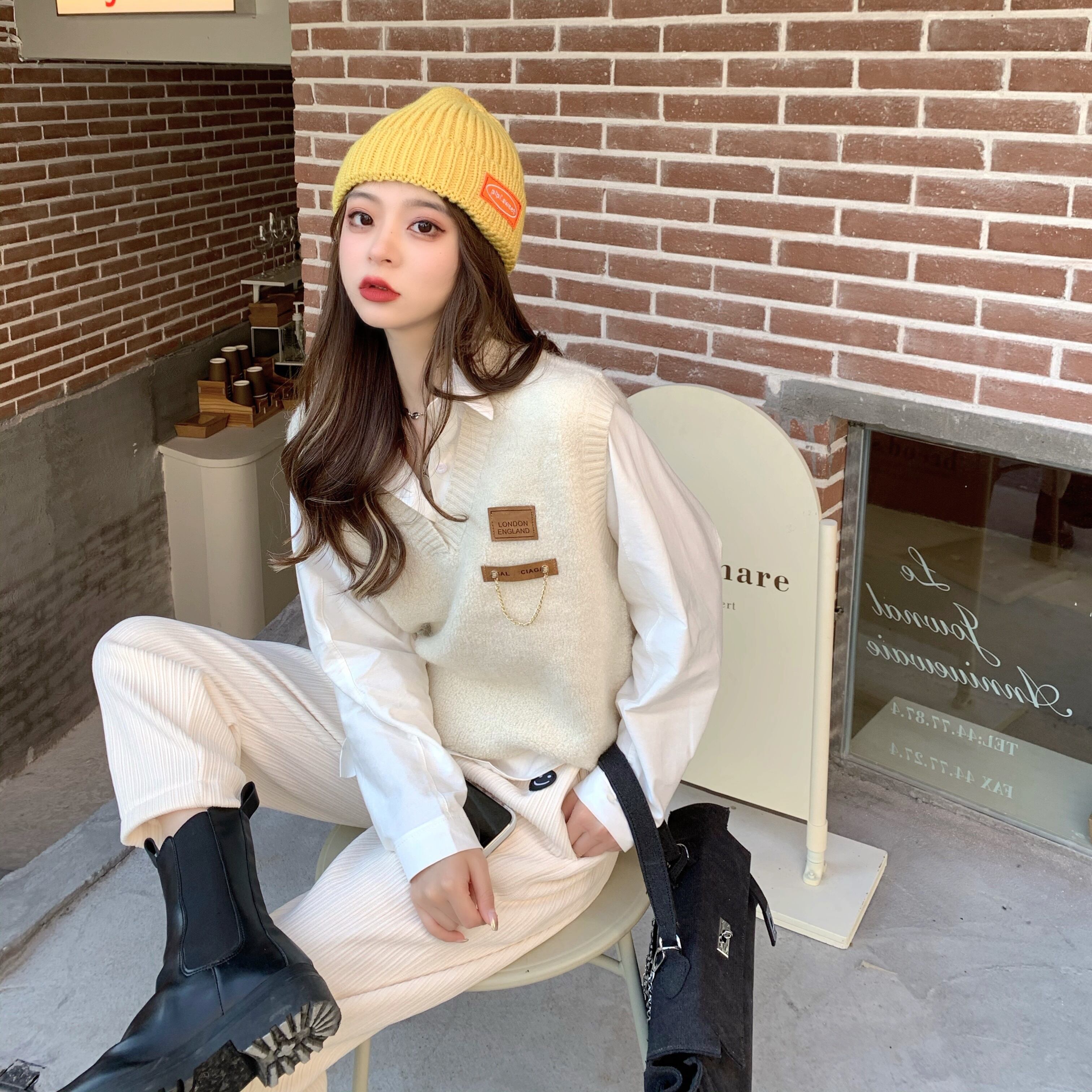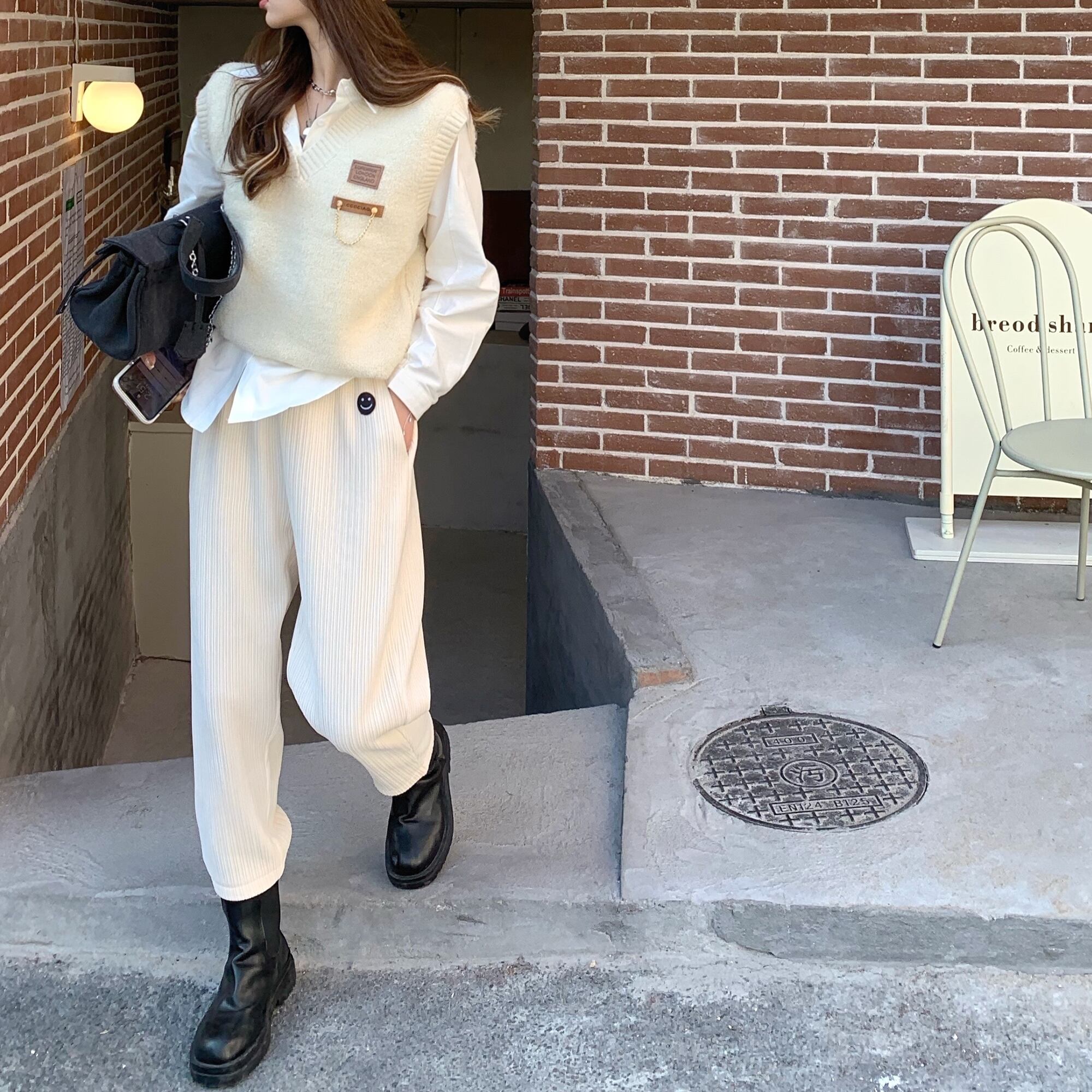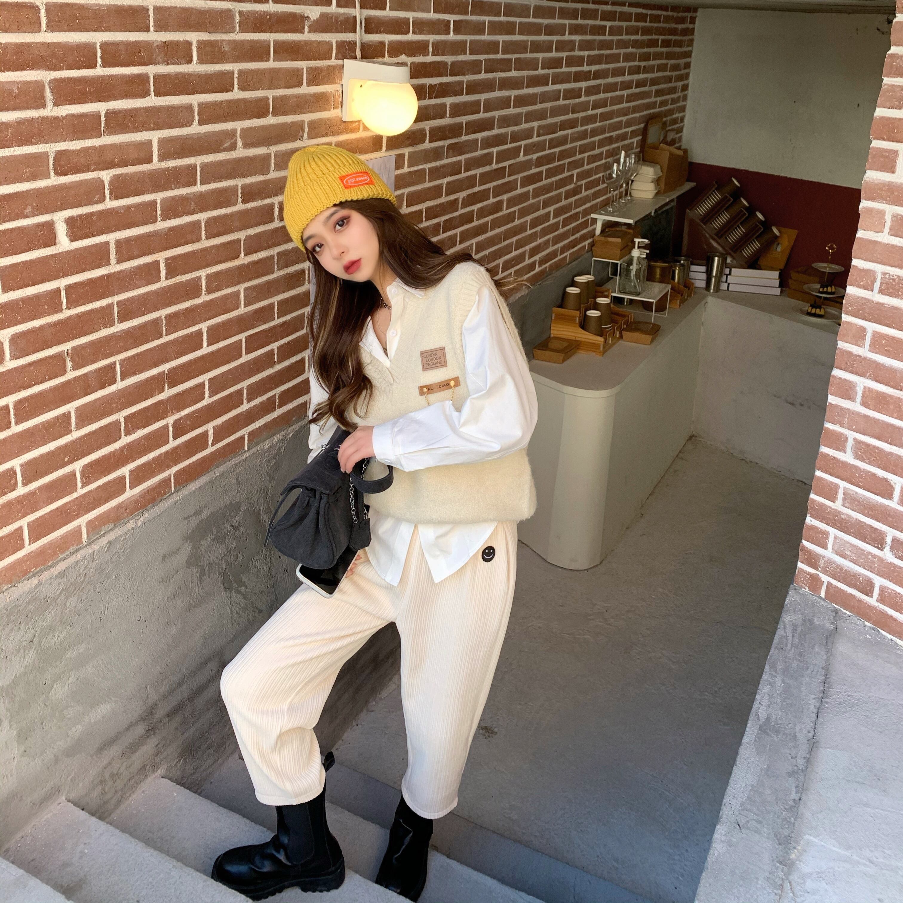 色:シャツ,グレーのベスト,グレーレターパンツ,アプリコットベスト,アプリコットスマイリーパンツ