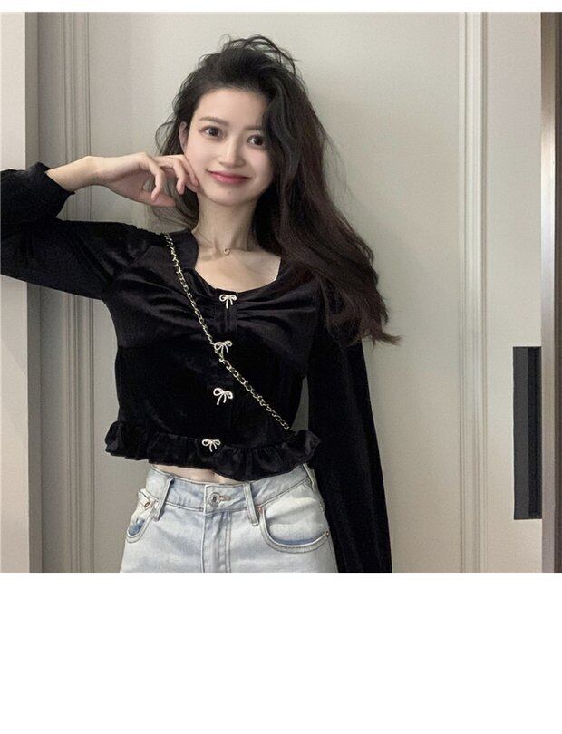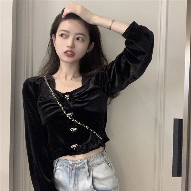 ベルベットシャツ スプリングサマースタンダードリボンブローチ ウェストショートトップス ロング レトロ 春物 夏物 セブンプリンセス71020544001