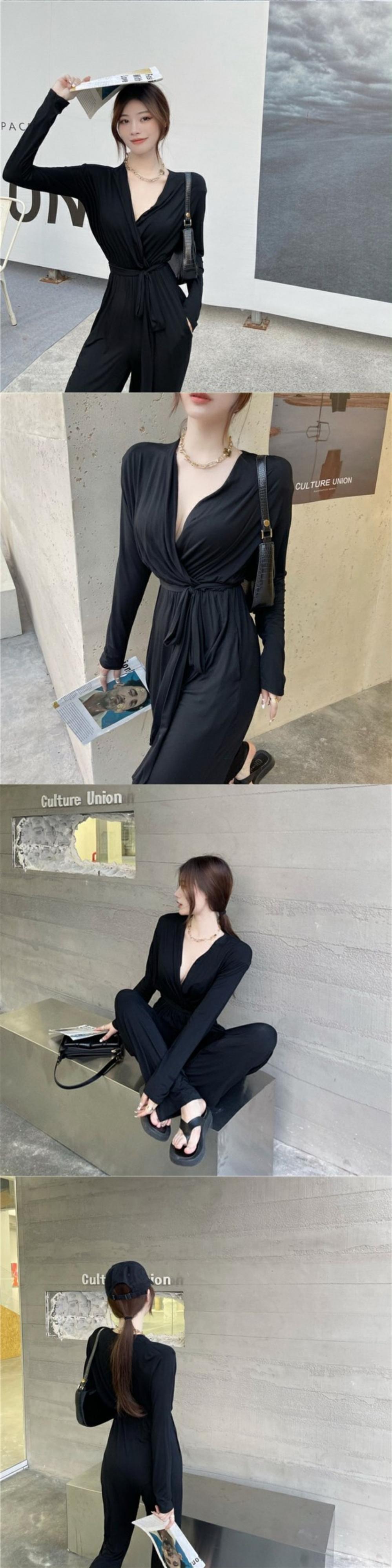 ジャンプスーツ オールインワン サマー薄手Vネックロングパンツ ブラック 夏物 セブンプリンセス85575433239