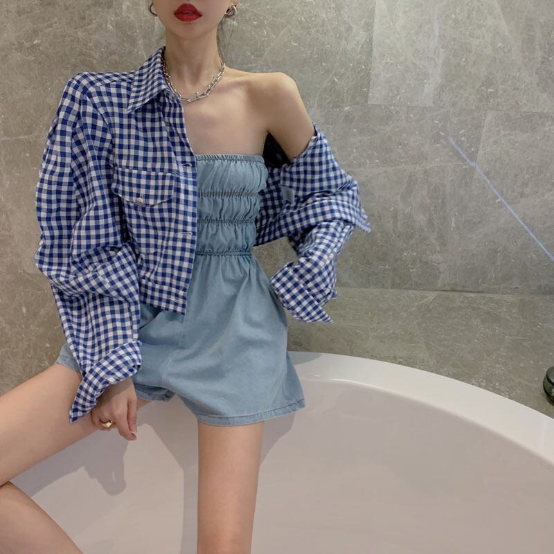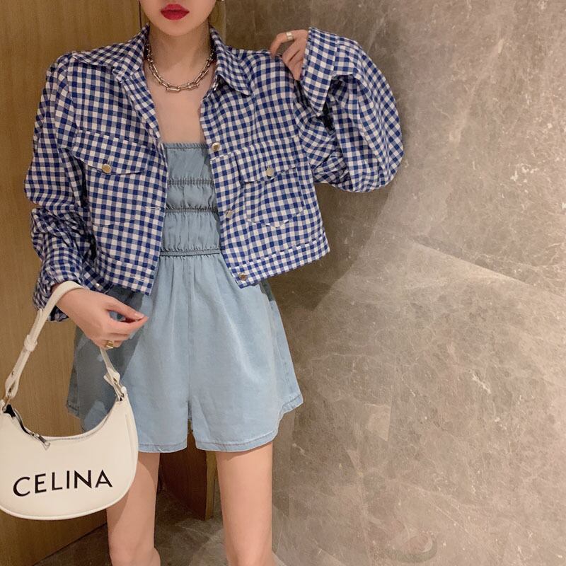 色:格子縞のシャツ,デニムジャンプスーツ