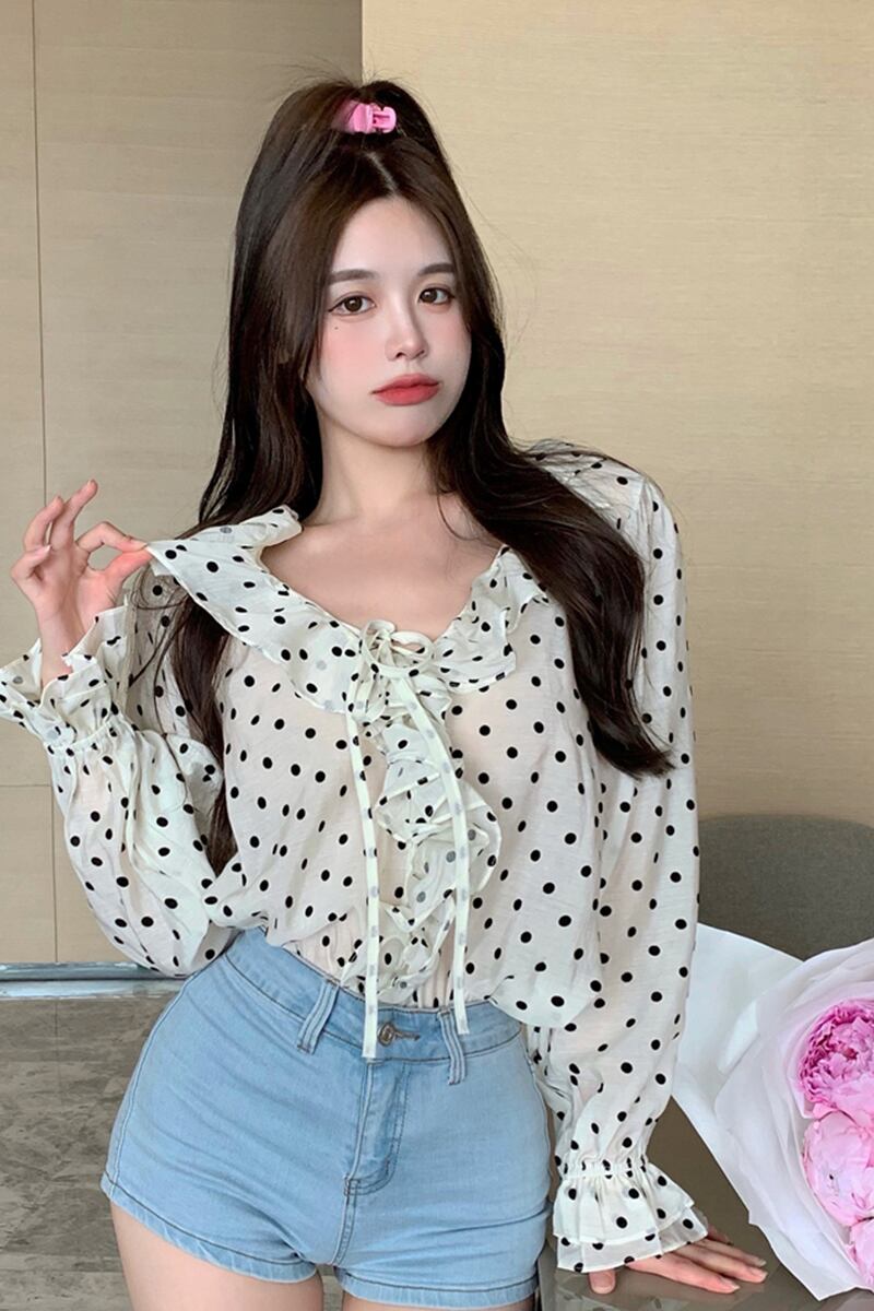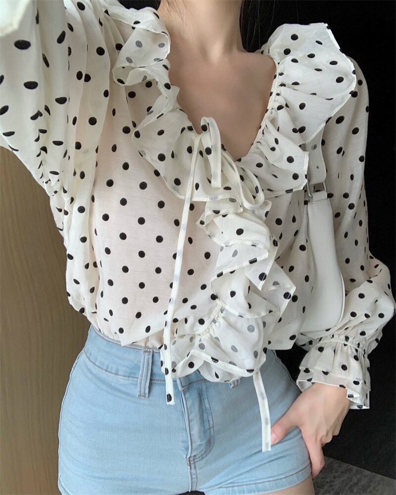 Vネックシャツ レディースサマー薄手ルーズ水玉トップス ロング 夏物 セブンプリンセス77517138809