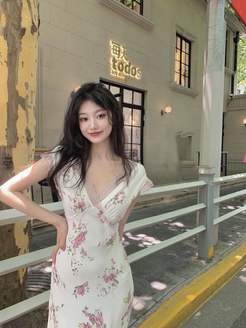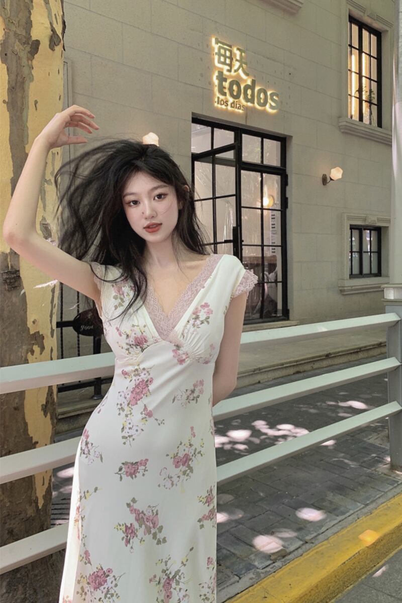 Vネックフローラルドレス ウェストスカート サマースタイル薄手ロング 夏物 花柄 セブンプリンセス88579280200