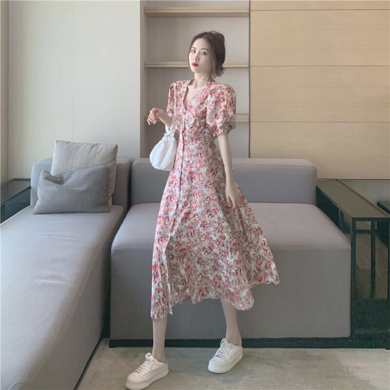 ドレス サマースタイルスタンダードロングスカート スリーブシフォンフローラル レトロ 夏物 花柄 セブンプリンセス56238419200