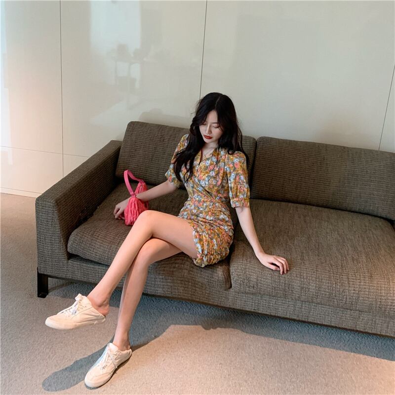 シフォンフローラルドレス スタンダードVネックスリーブスカート サマースリム レトロ 夏物 花柄 セブンプリンセス38424374233