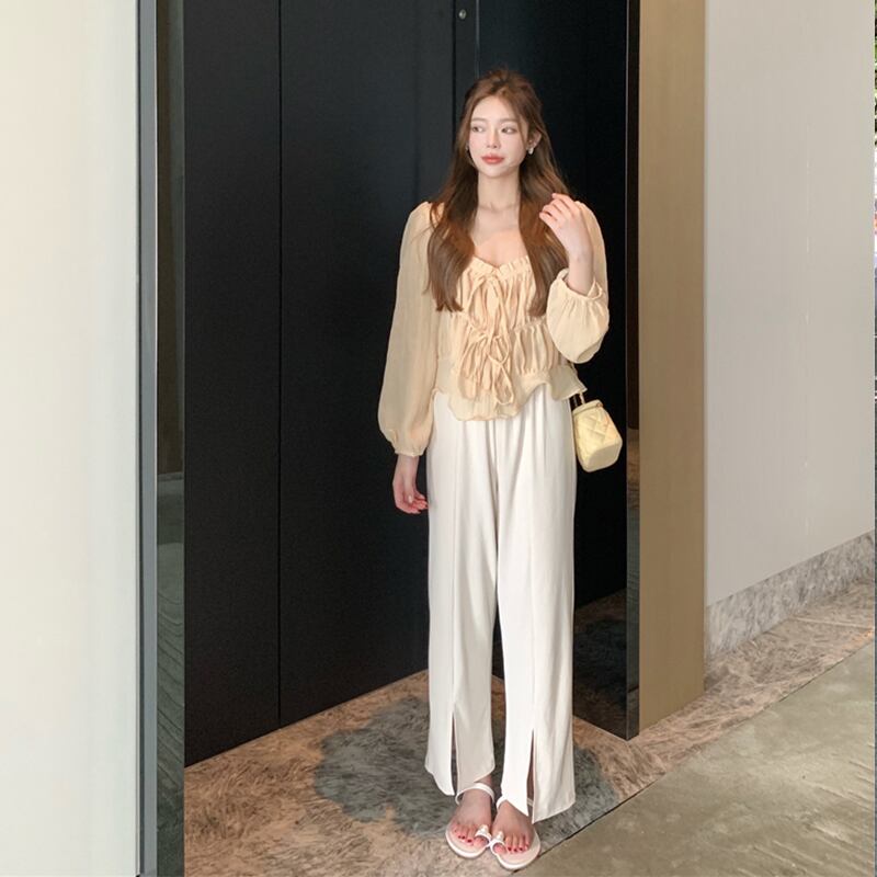 色:ワイドレッグパンツ,クリーミーな黄色のトップ