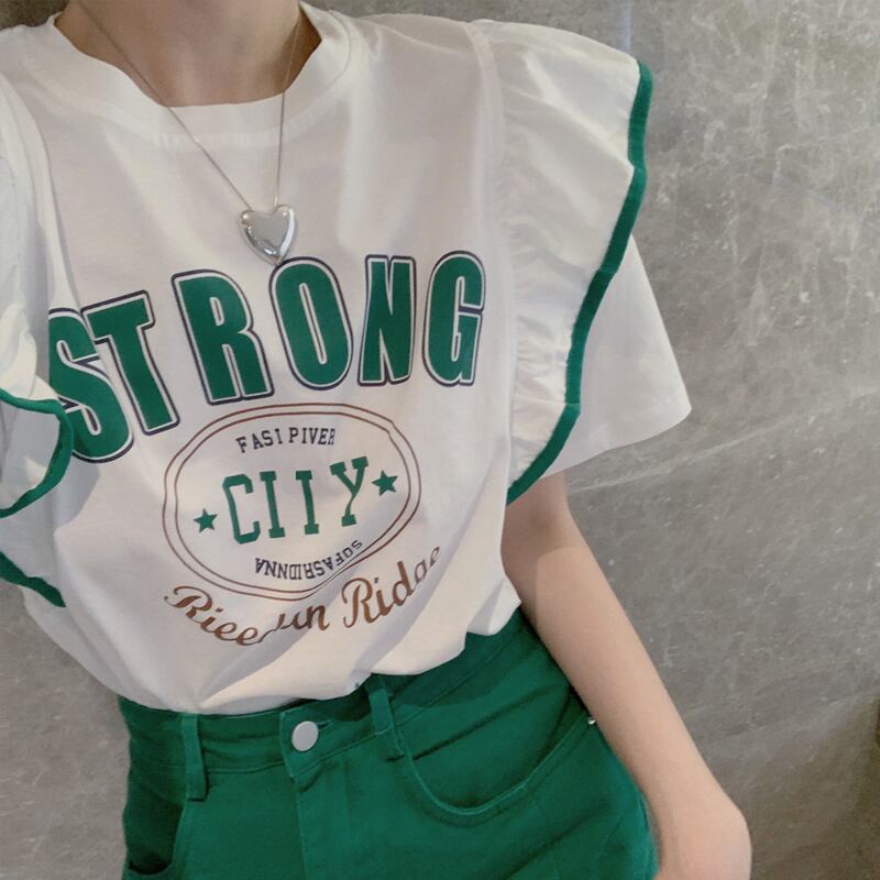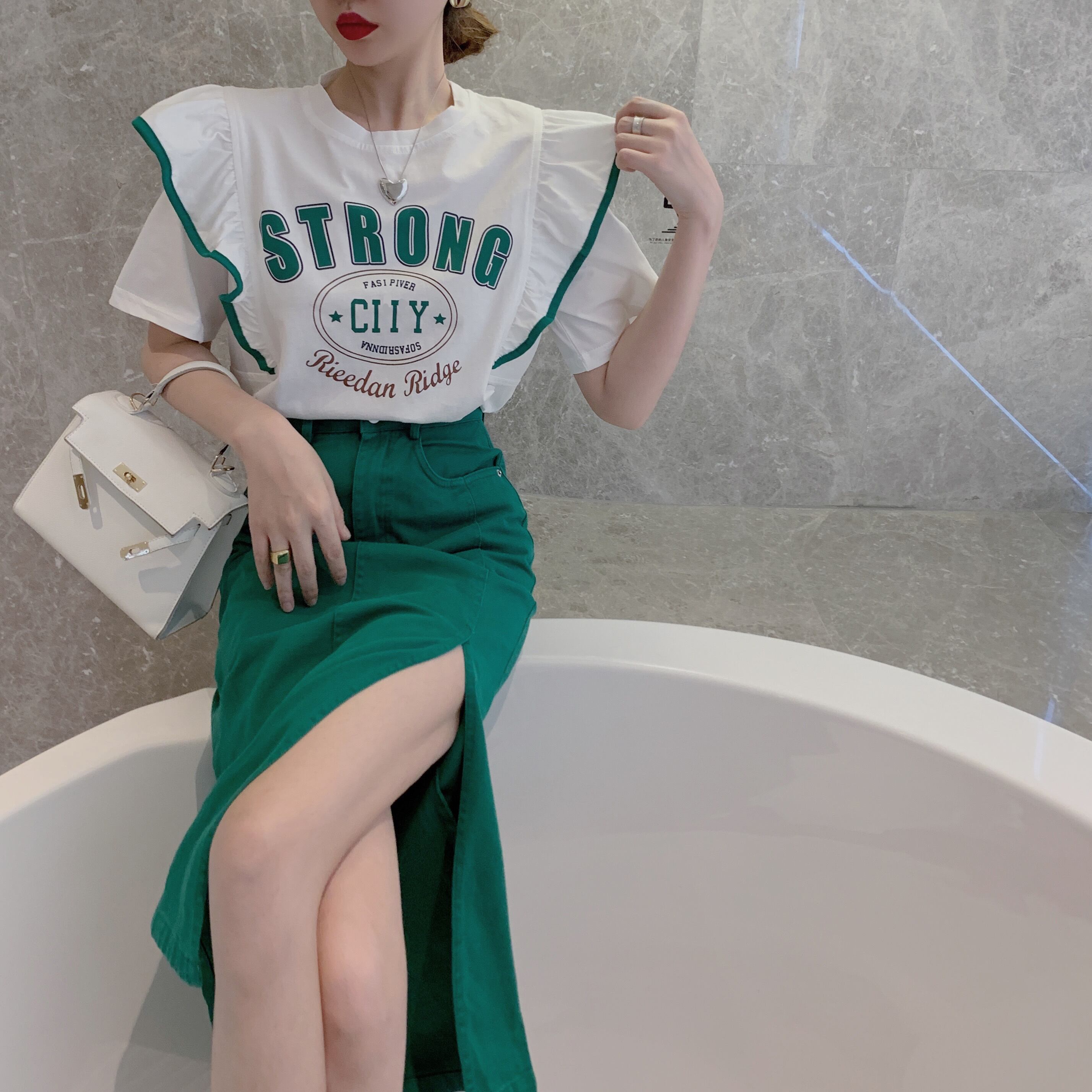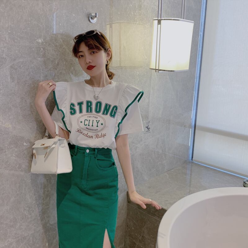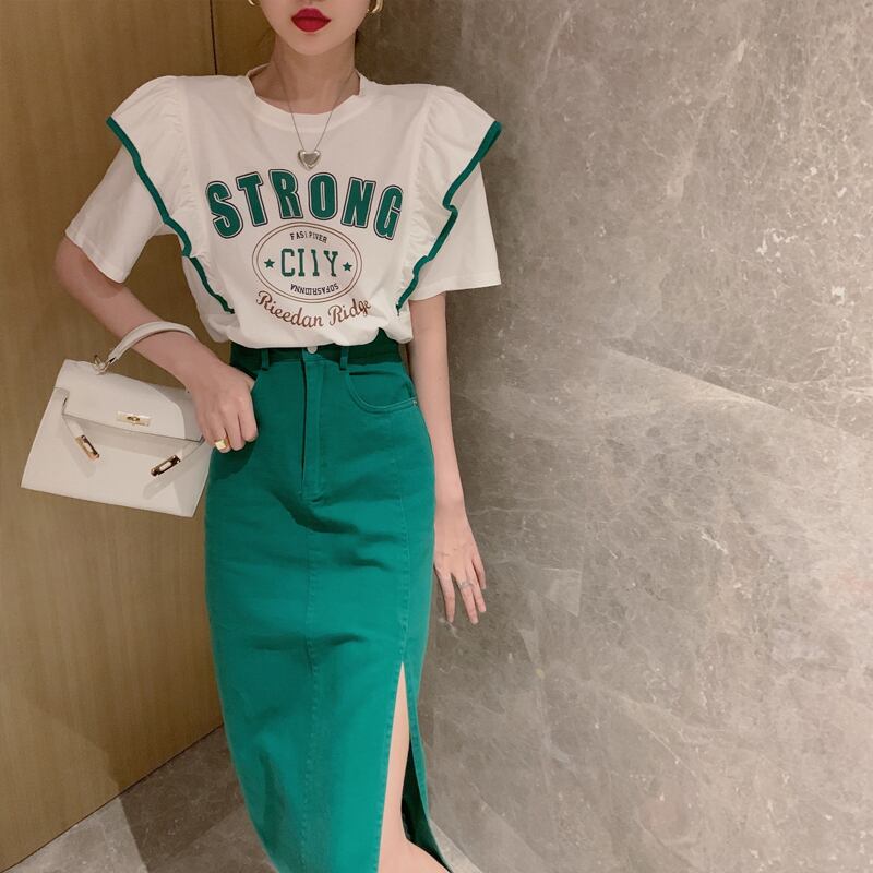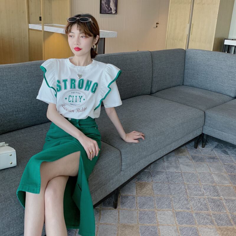 色:ウエストスリット無地スカート,レタープリント半袖Tシャツ
