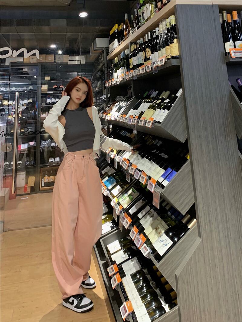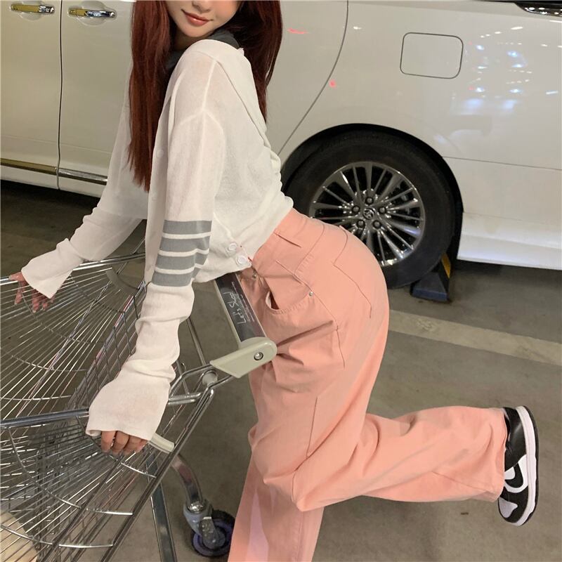 色:白いカーディガン,ピンクジーンズ,グレーの巾着スカート,グレーのカーディガン