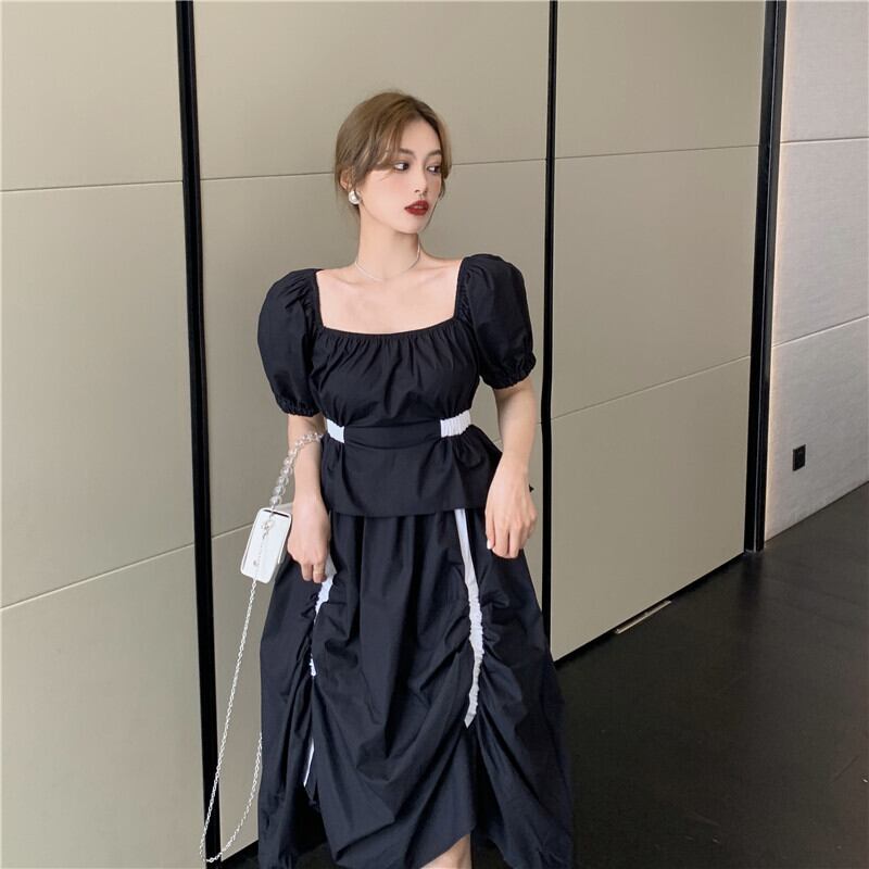 スタイルスリーブドレス サマーカラースタンダードブラックロングスカート ウェスト薄手Aライン レトロ 夏物 スクウェア セブンプリンセス10574271789