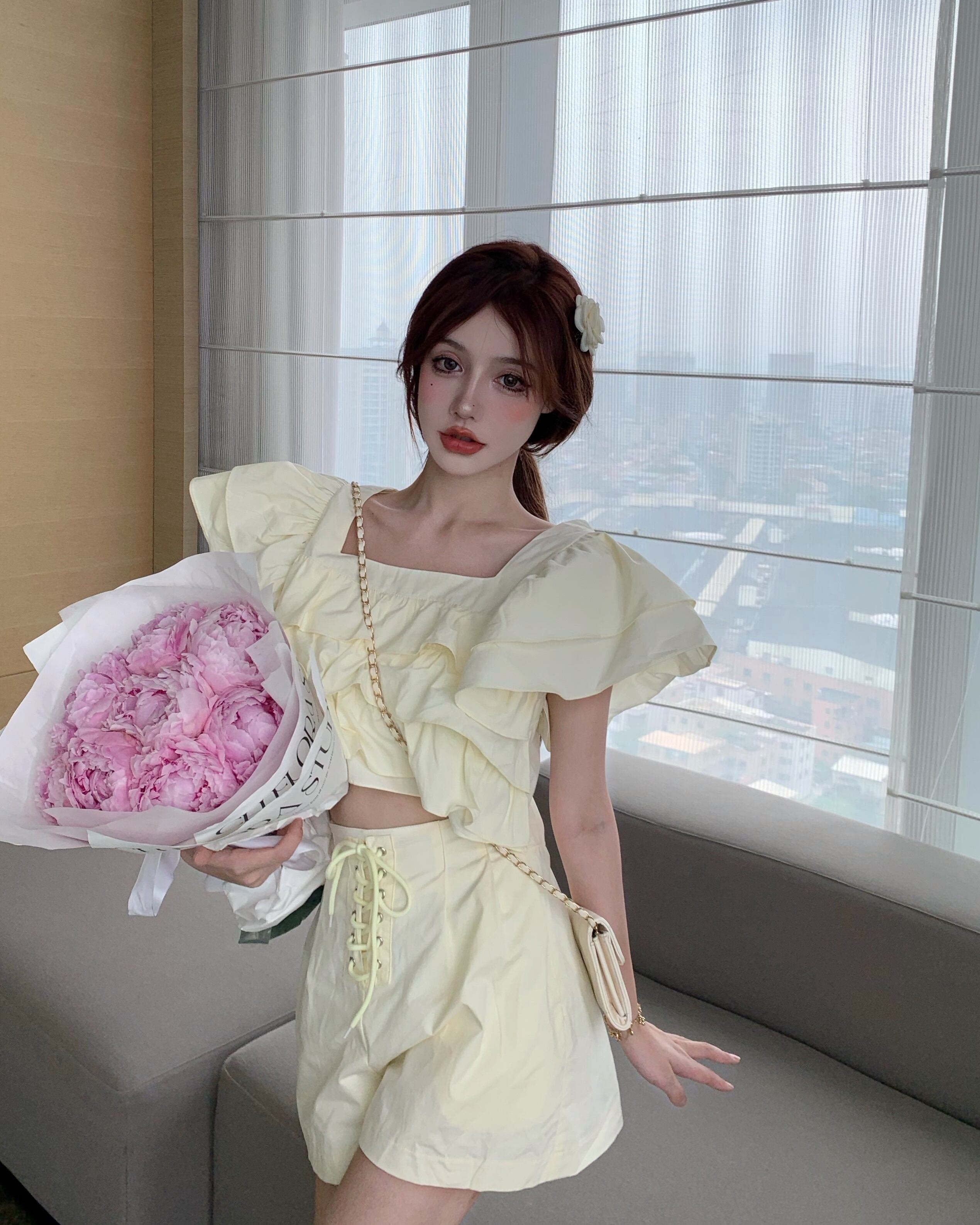 レディースサマーショートラッフルシャツ ハイウェストウェストバンドワイドレッグショーツ 大人ガーリー スウィート キュート カジュアル 夏物 ブルマー ワイドパンツ スクウェア セブンプリンセス47578291899