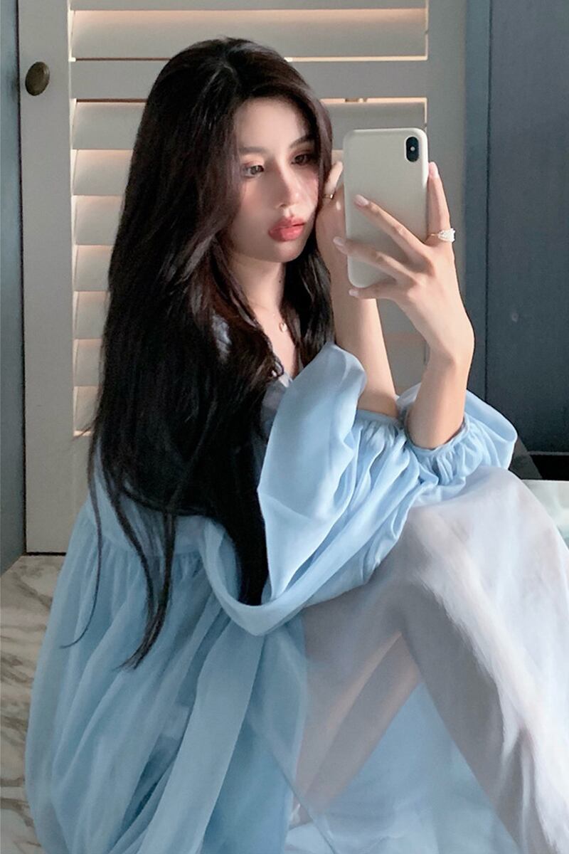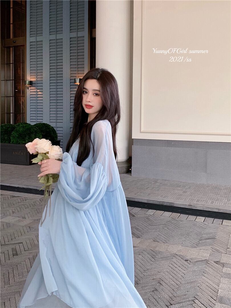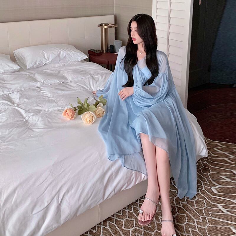 メッシュドレス サマースリーブブルーシフォンスカート ルーズ ロング 夏物 セブンプリンセス50528771781