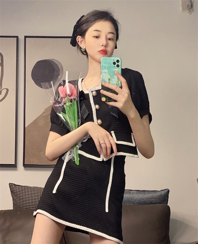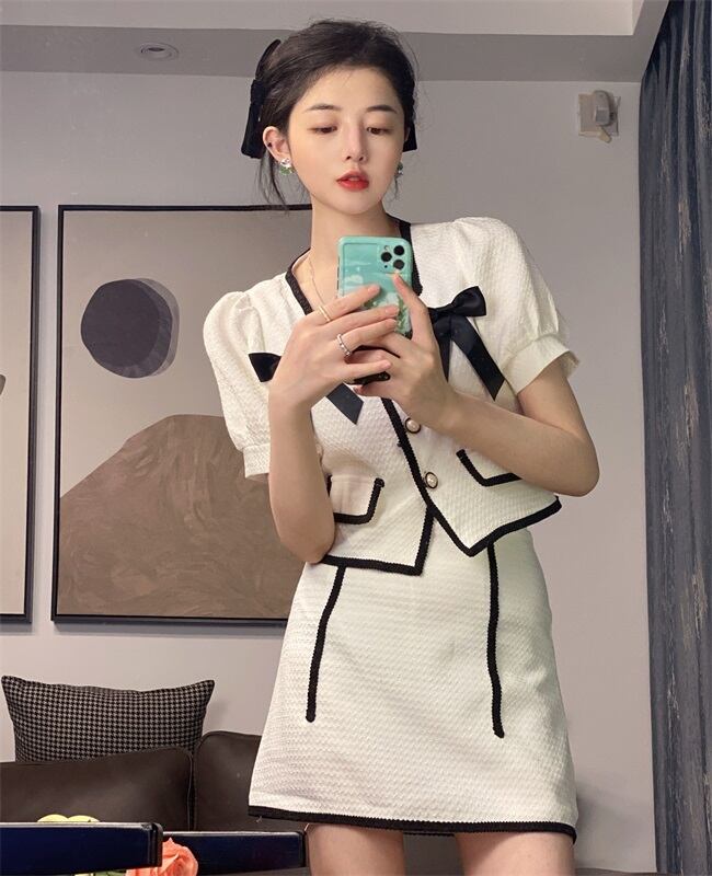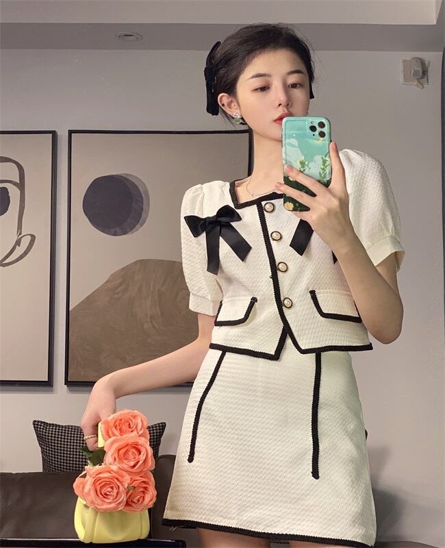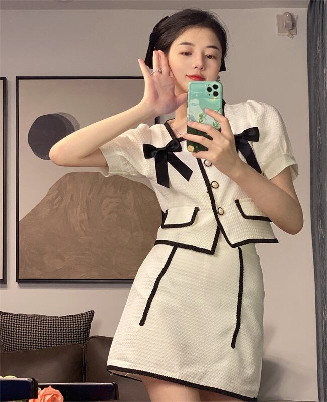 色:白いスカート,ホワイトトップ,黒スカート,ブラックトップ