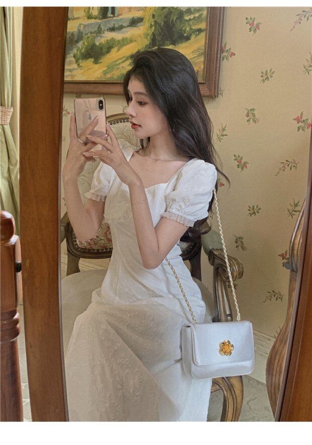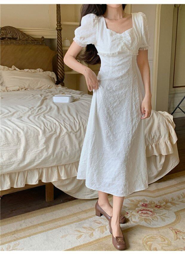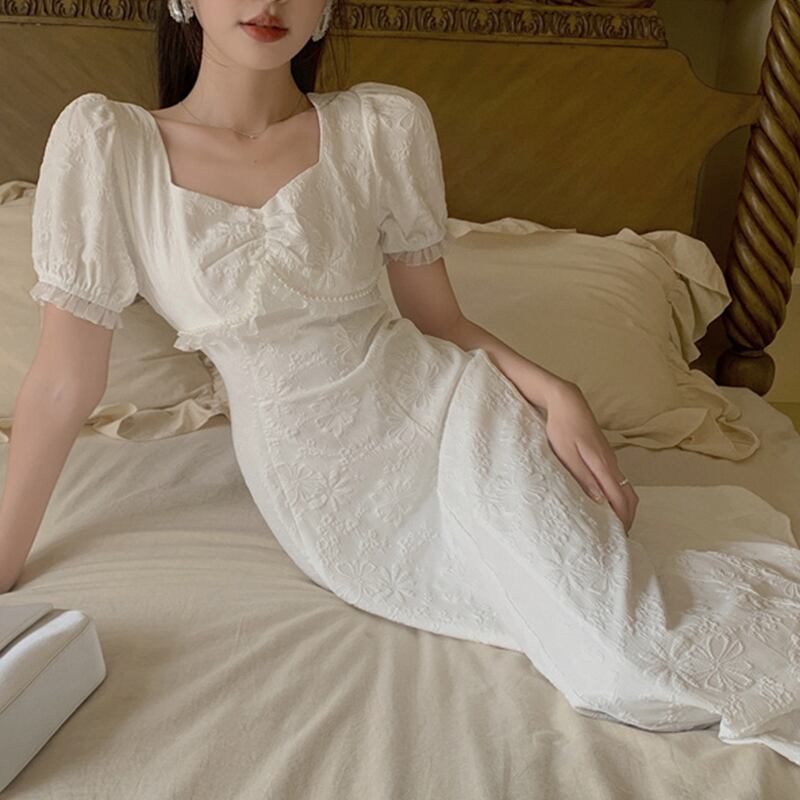 ドレス サマースタンダードスリーブスリムスカート ウェストホワイトAラインロング レトロ 夏物 セブンプリンセス71762635944