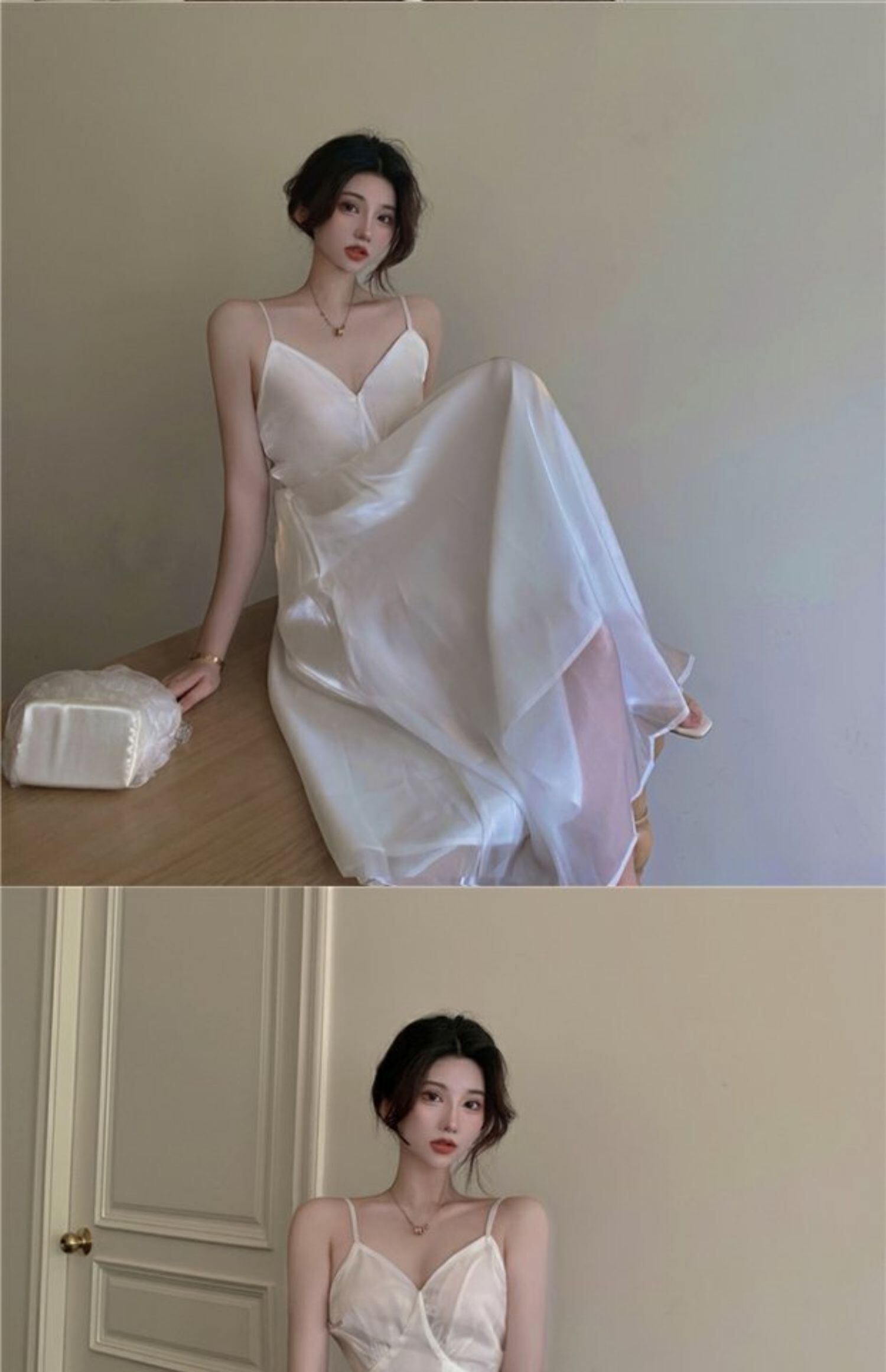 スカート サマースタンダードホワイトVネックウェストロングドレス レトロ 夏物 セブンプリンセス74715663607