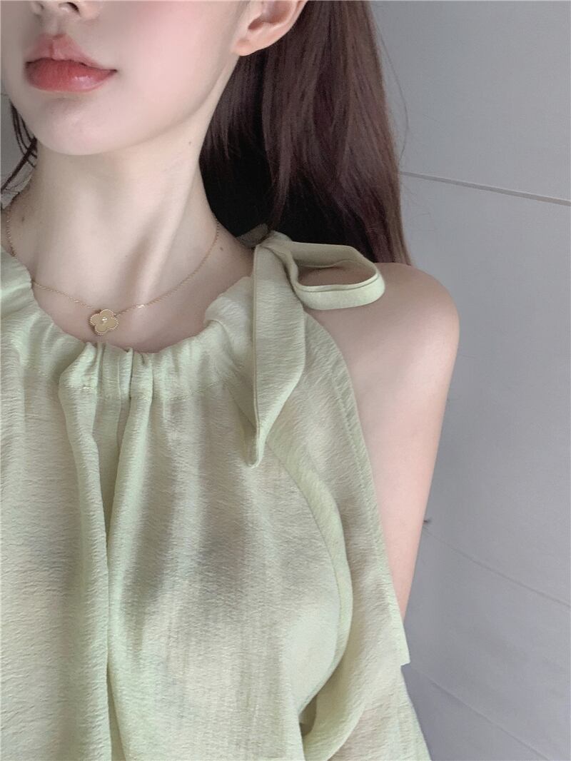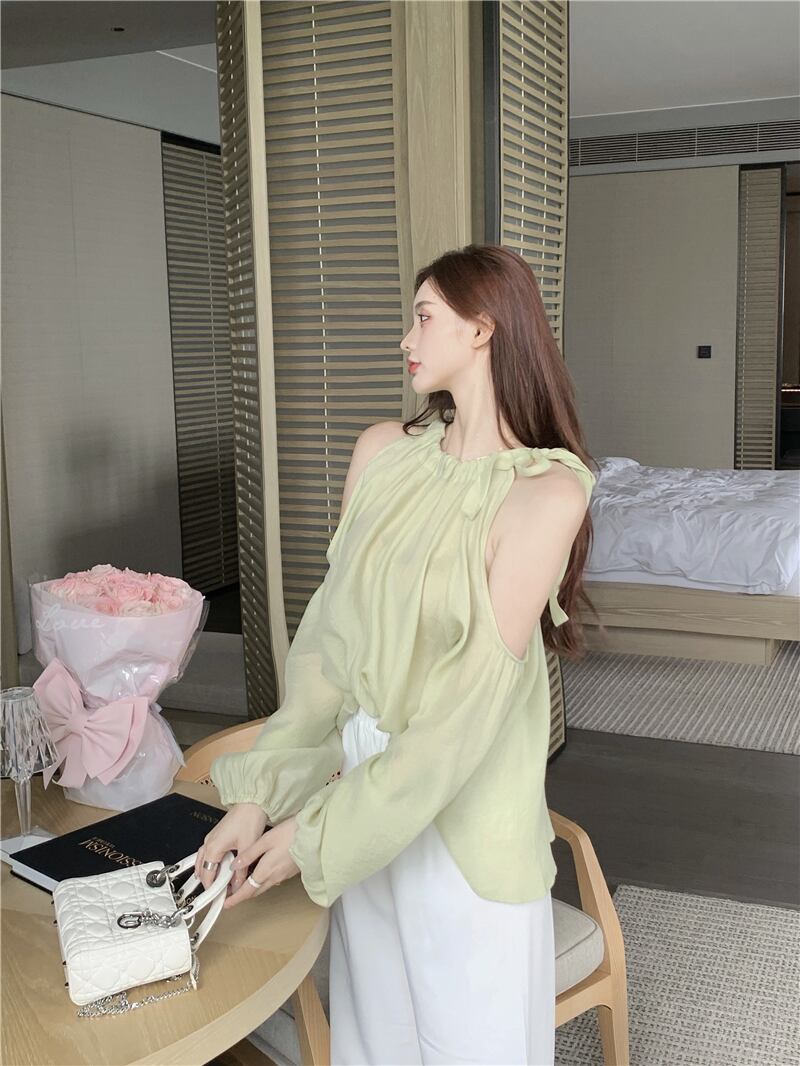 ホルタートップス レディースサマー薄手ルーズグリーンシフォンシャツ ロング 夏物 オフショルダー セブンプリンセス87738947244