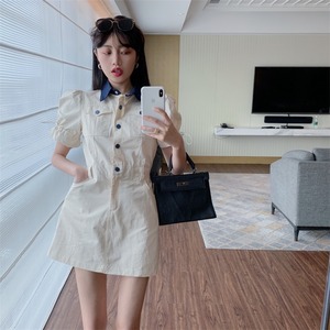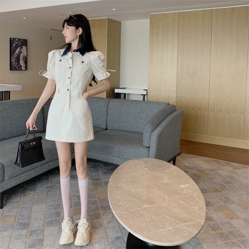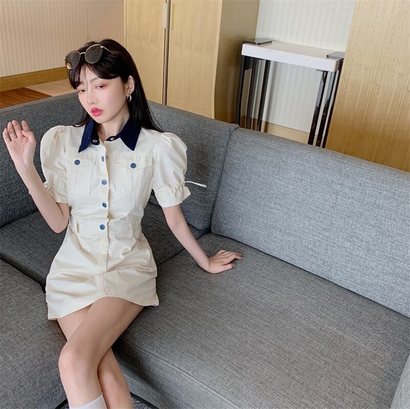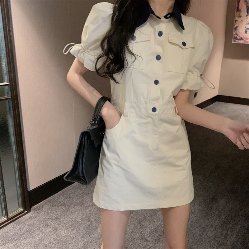 ドレス サマーウェストカラーギャザースリーブスカート スリム 夏物 セブンプリンセス85798857580