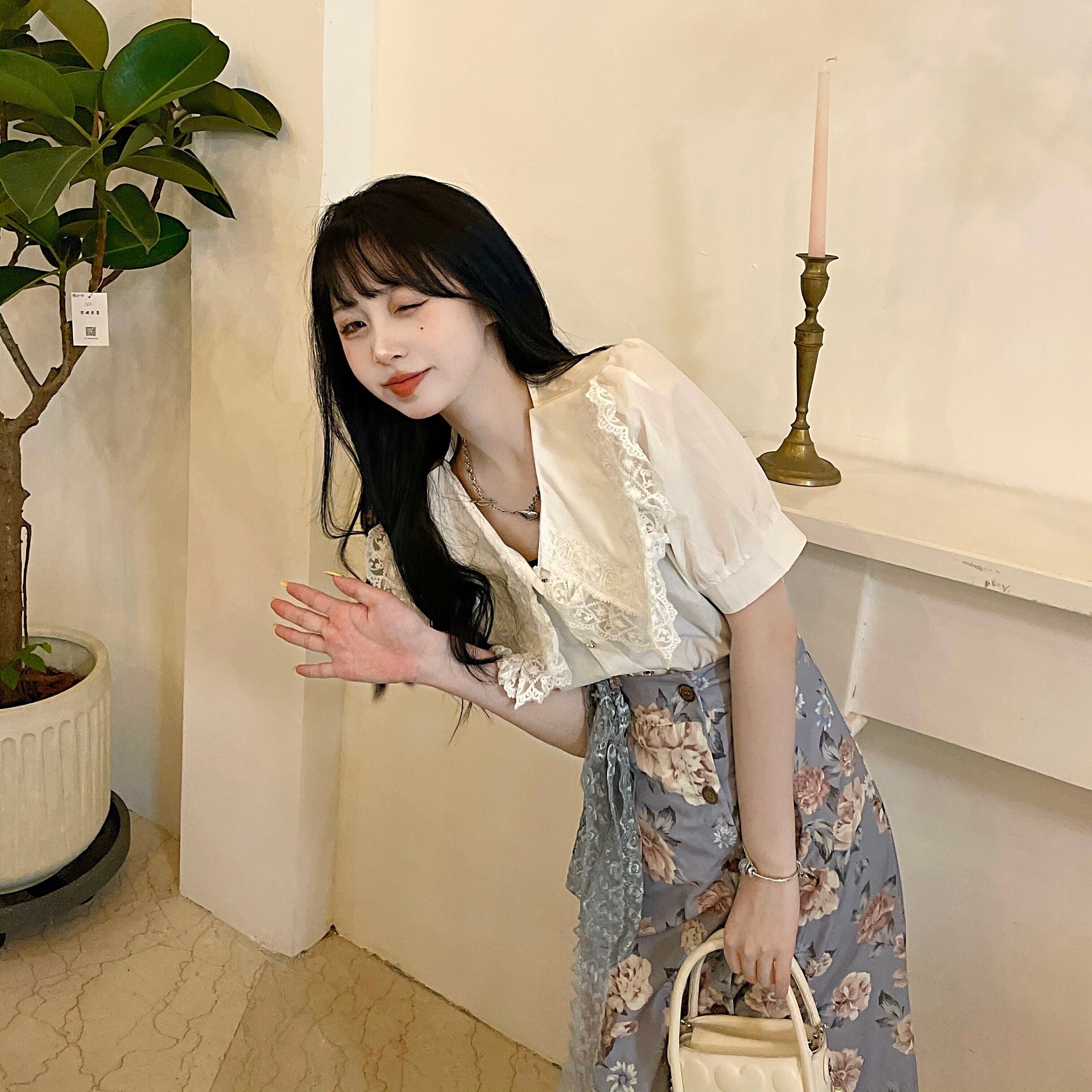 カラーホワイトレースシャツ スタンダードフローラルスカート レトロ 花柄 セブンプリンセス57781442426