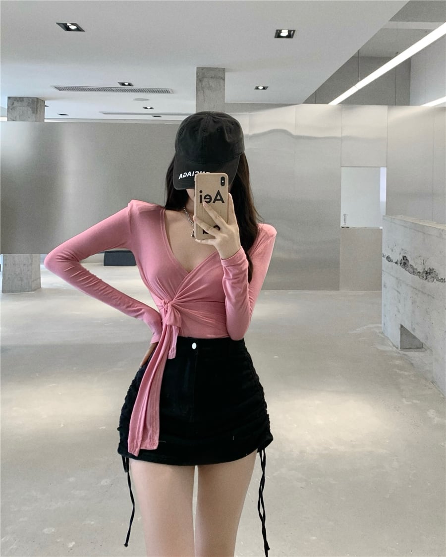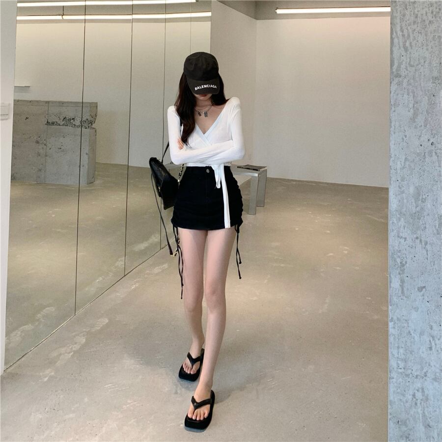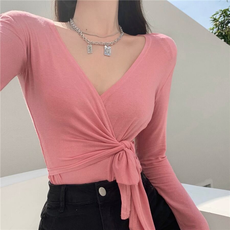 薄手Vネックストラップ クロススリムTシャツ ロング セブンプリンセス60780935026