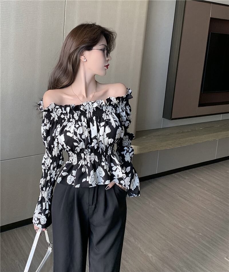 プリーツウェストワンショルダースタンダードシフォンシャツ レディースサマーショートブラックホワイトフローラル レトロ 夏物 花柄 セブンプリンセス85636272182