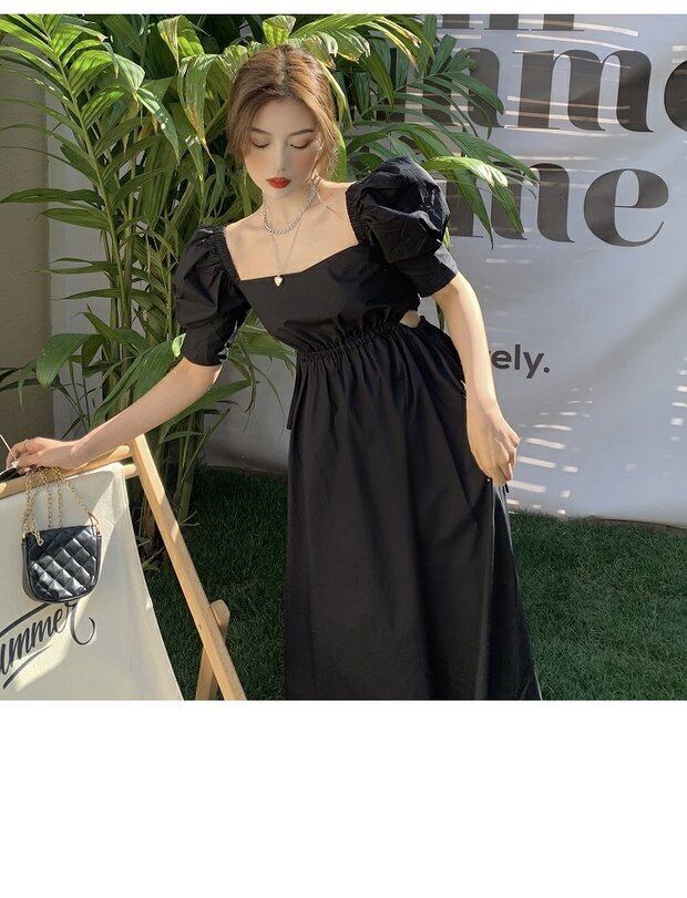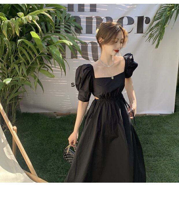 スタイルドレス サマーカラースタンダードブラックスカート ウェストAラインロング レトロ 夏物 スクウェア セブンプリンセス36626587880