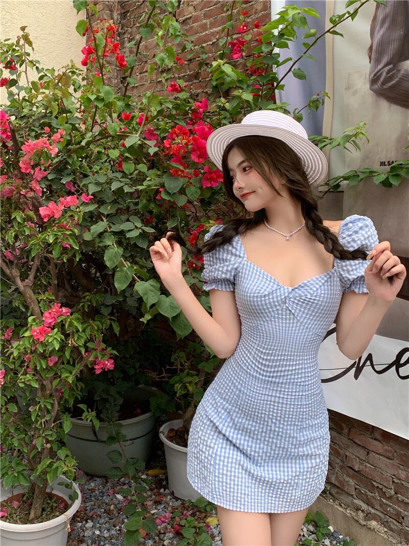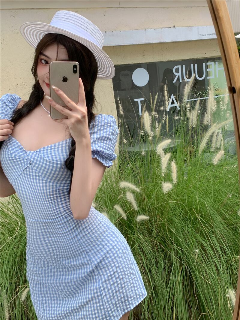 スリーブ格子柄ドレス サマーウェストカラーショートスカート スタンダード レトロ 夏物 スクウェア セブンプリンセス50758753738