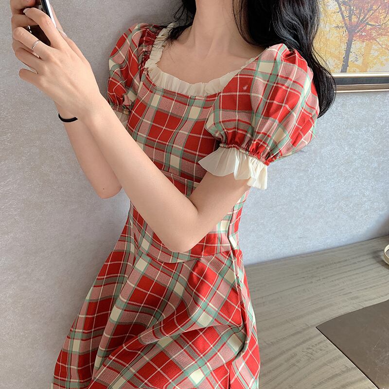 スタンダード格子柄レッドドレス スプリングサマーカラースリーブウェストスカート レトロ 春物 夏物 スクウェア セブンプリンセス40611464426