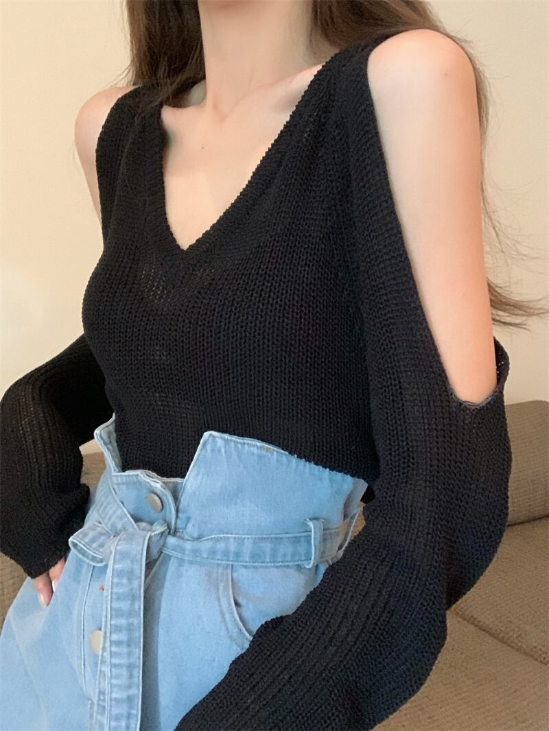 ブラウス レディースサマー薄手ルーズVネックセーター スタンダードスリムショートトップス ロング レトロ 夏物 セブンプリンセス32212183674
