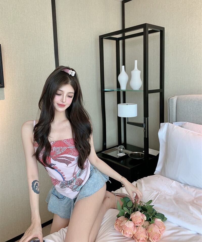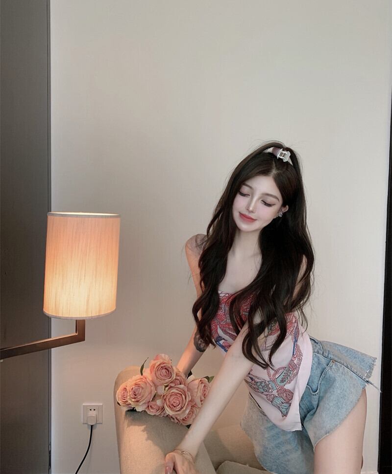 色:白いカーディガン,スリングチューブトップ,デニムショートパンツ