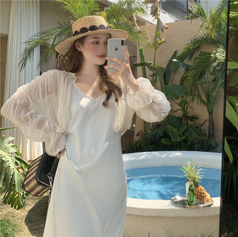 ドレス サマーVネックサテンAラインロングスカート スリムスタイルシフォン 夏物 セブンプリンセス46591196426