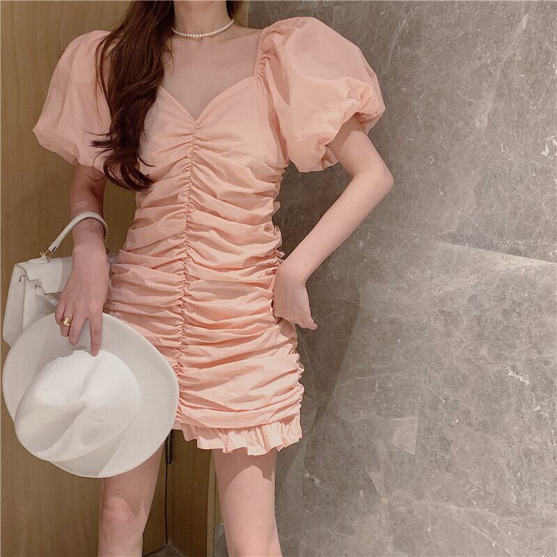 スリーブドレス Vネックブラックウェストスカート サマー薄手スタンダードAラインショート レトロ 夏物 セブンプリンセス2175631540