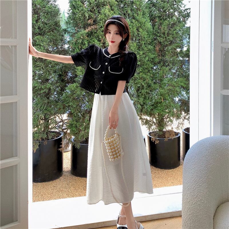 色:白いスカート,ホワイトトップ,フルーツグリーンスカート,ブラックトップ