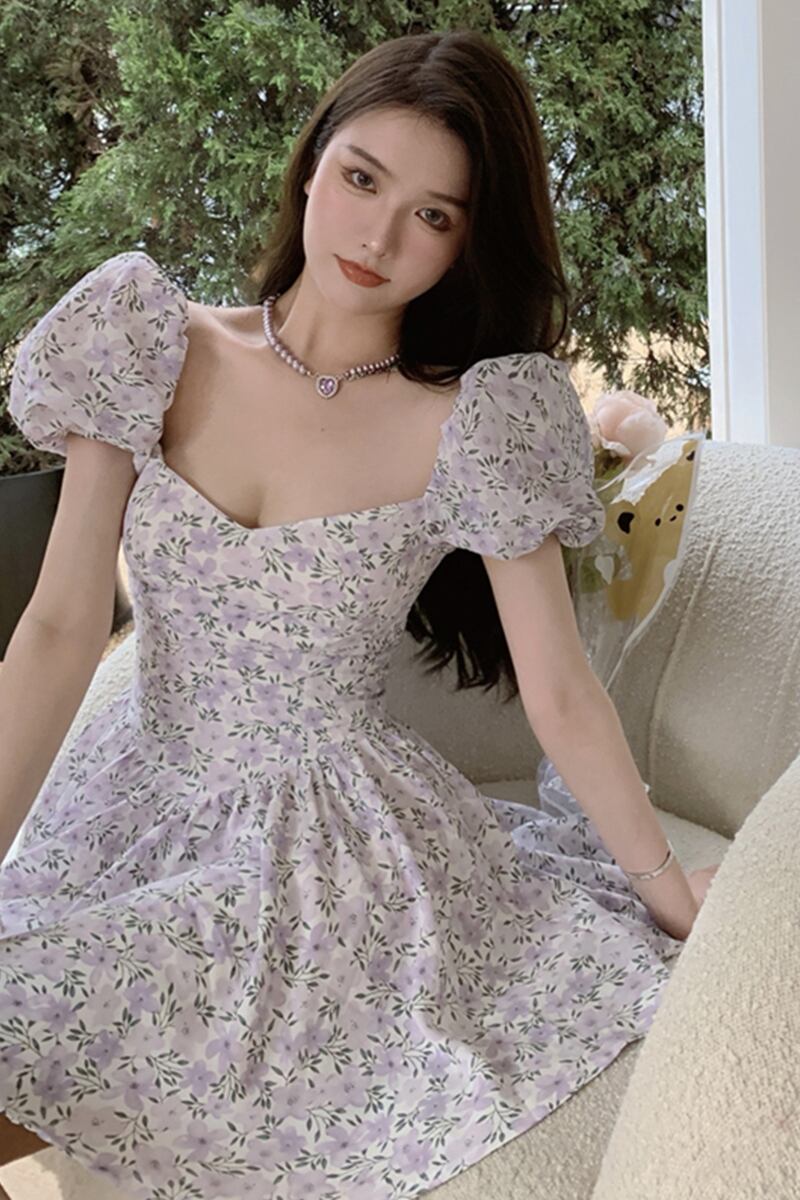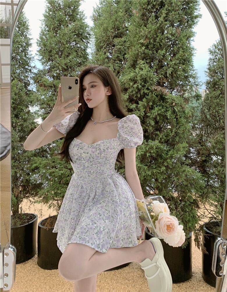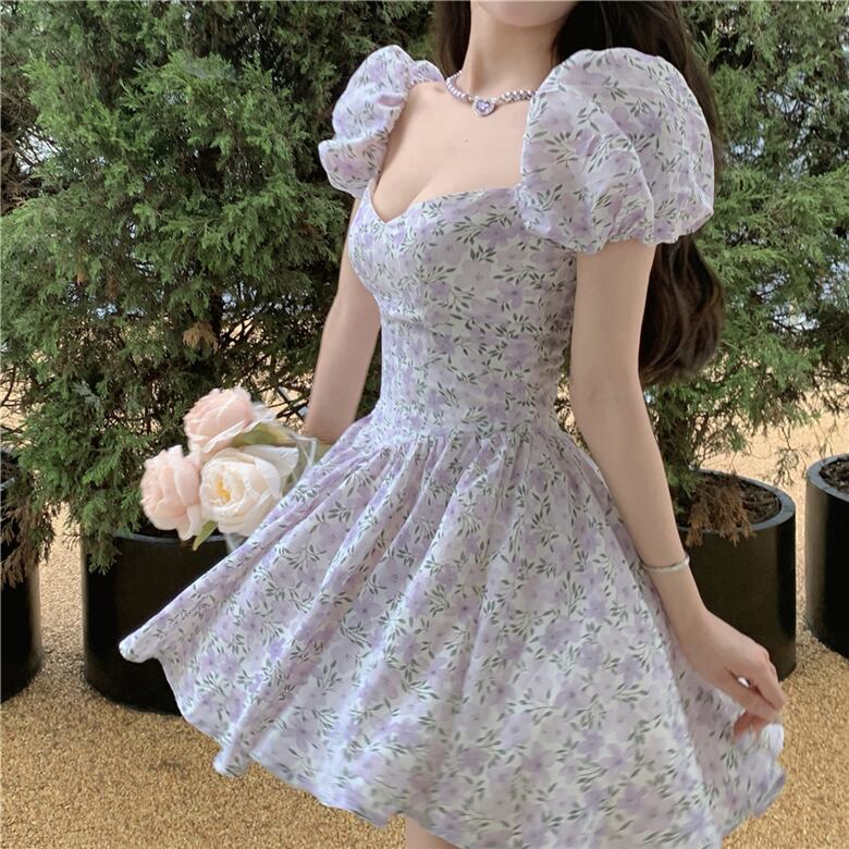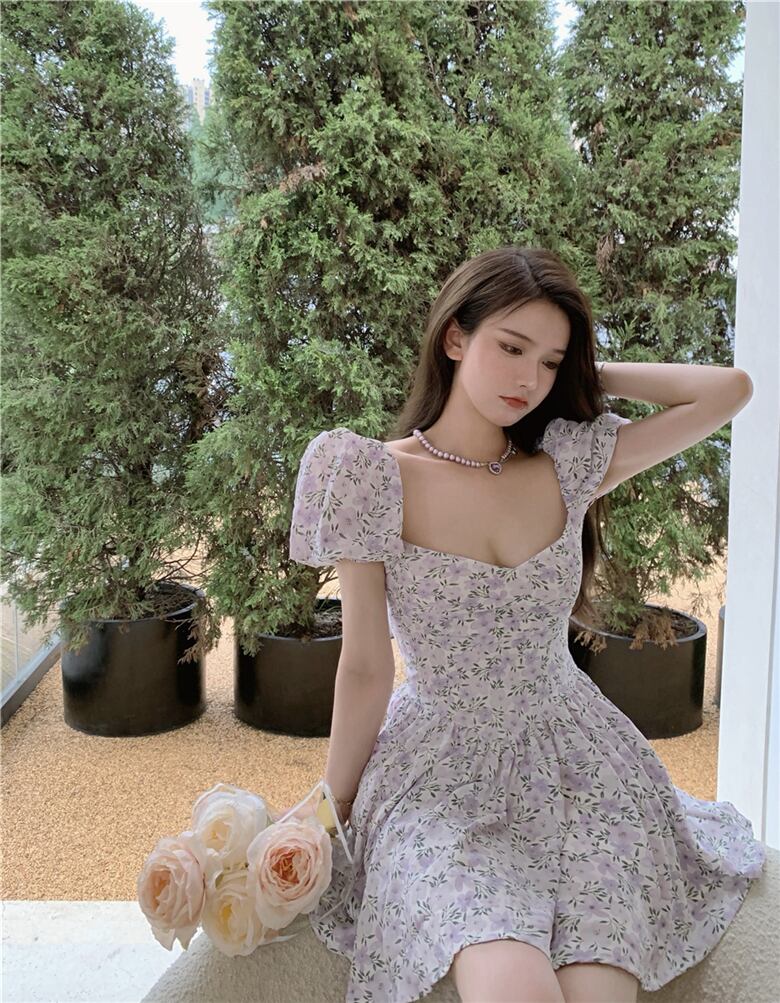 スリーブフローラルドレス サマーVネックショートスカート ウェスト薄手 夏物 花柄 セブンプリンセス84757184311