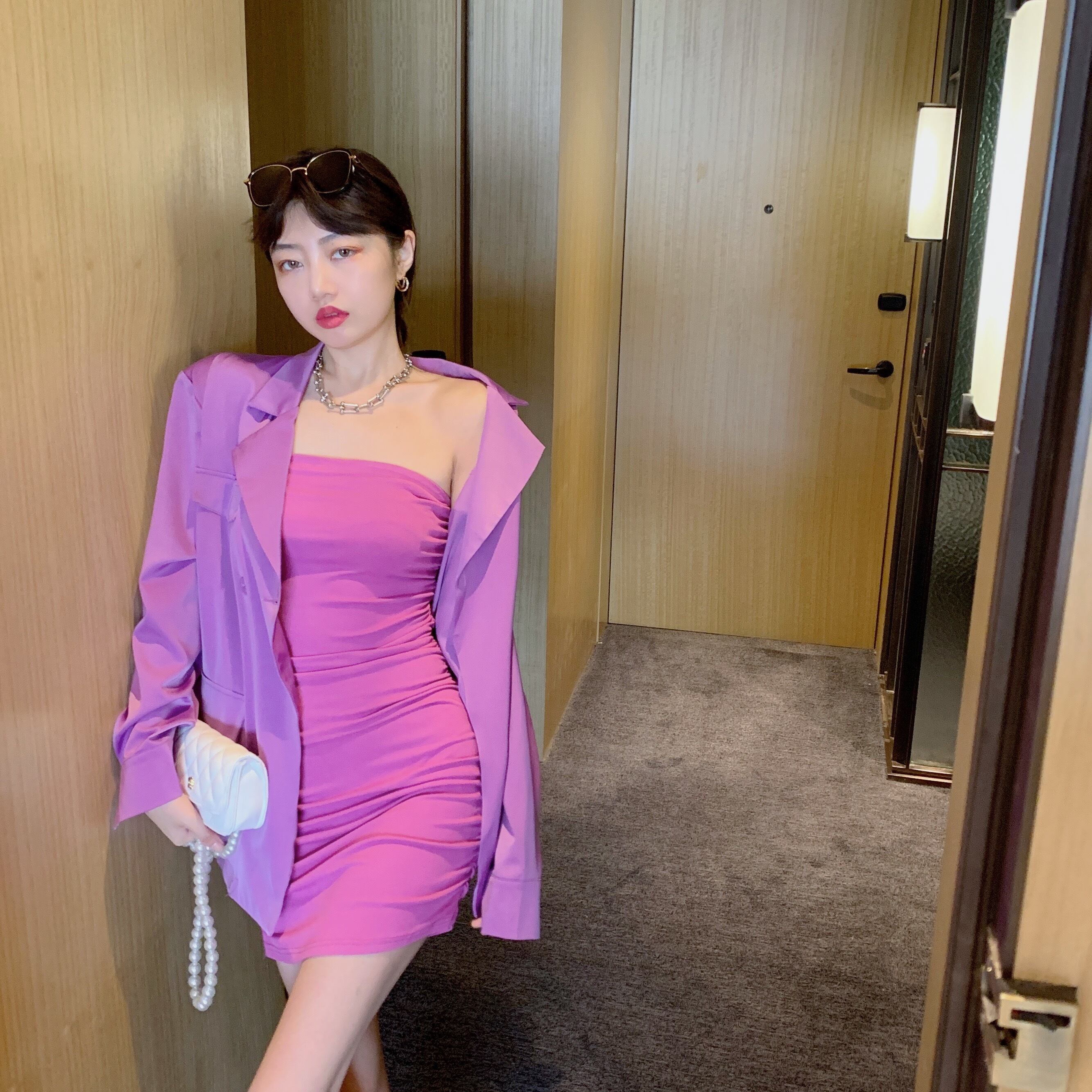 色:ピンクパープルスーツ,クリムゾンイエローのスーツ,ローズレッドのチューブトップスカート,黄色のチューブトップスカート